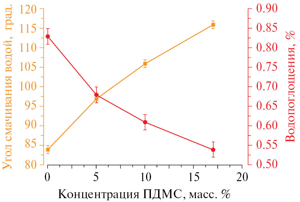Влияние полимера линейного строения ПДМС на основные параметры водостойкости – угол смачивания водой и водопоглощение