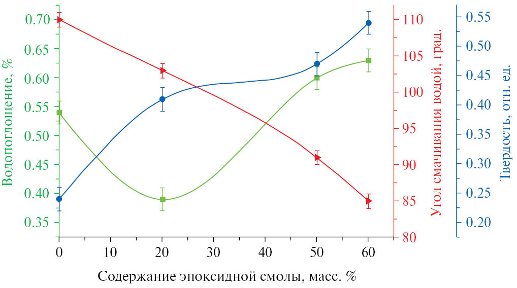 Рис. 5. Зависимости показателей твердости, степени гидрофобности и водопоглощения, ОСП на основе кремнийорганического лака КО-921, модифицированного 17 масс. % ПДМС и эпоксидной смолой, от количества эпоксидной смолы: ■ – водопоглощение, ► – угол смачивания водой, ● – твердость