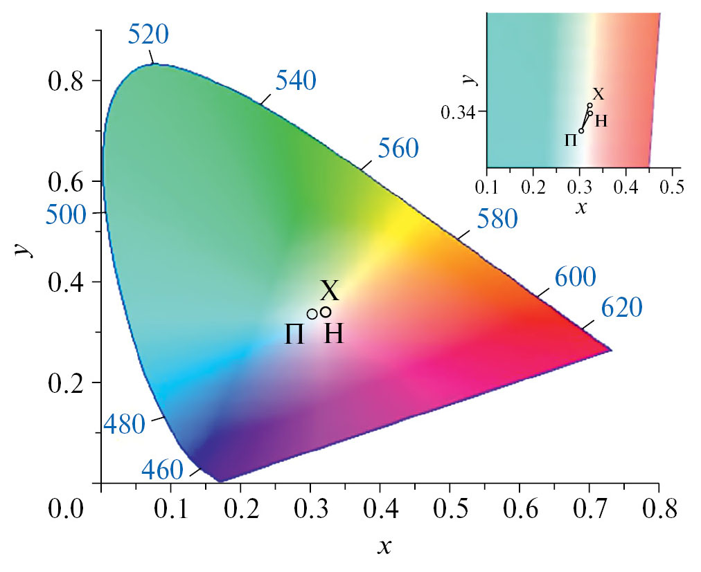 Рис. 7. Смещение цветового тона ОСП на основе кремнийорганического лака КО-921, модифицированных 17 масс. % ПДМС и 20 масс. % эпоксидной смолы. На врезке: смещение цветового тона ΔE в условиях тропического саванного (Нячанг – Н) и субэкваториального климата (Хошимин – Х) за 16 месяцев экспозиции по отношению к моменту постановки (П)