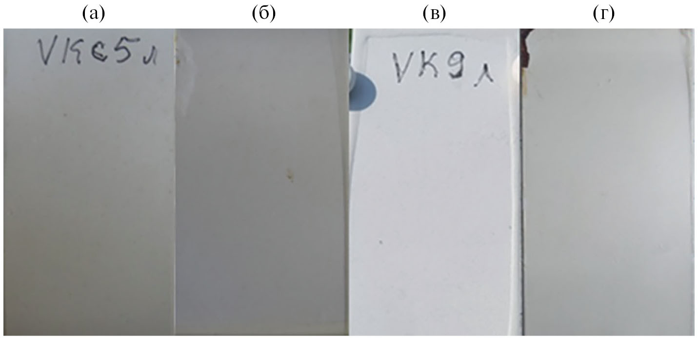 Рис. 10. Фотоснимки ОСП на основе кремнийорганического лака КО-921, модифицированные 17 масс. % ПДМС и 20 масс. % эпоксидной смолы, нанесенные на стеклопластик, через 8 месяцев экспозиции в очень холодном климате