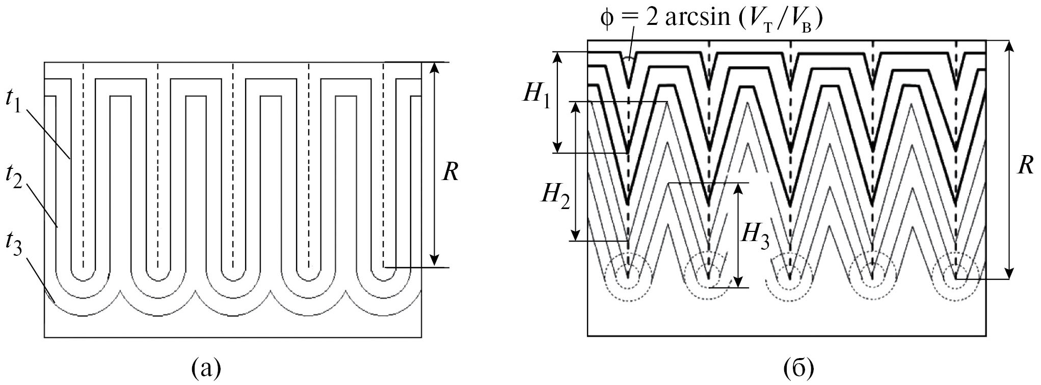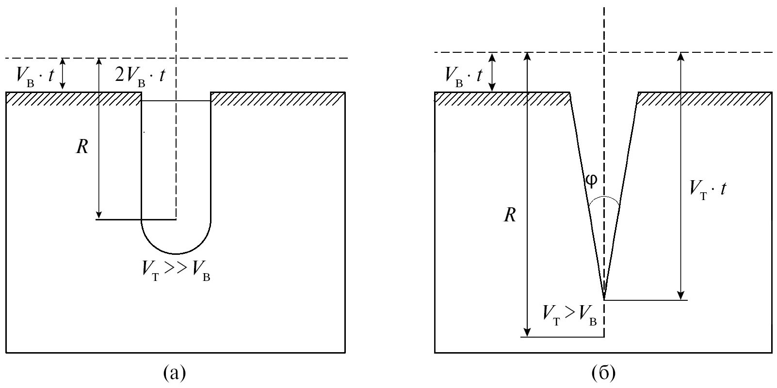 Рис. 1. Геометрия травления трека в однородном материале с высокой (а) и низкой (б) избирательностью [29]. Форма образующегося при травлении трека углубления определяется соотношением скоростей травления вдоль трека (VT) и травления неповрежденного материала (VB), а также длиной пробега частицы в материале. R – пробег иона в материале, φ – угол при вершине вытравливаемого конуса (определяется величиной избирательности травления φ = 2 arcsin V). В случае (а) угол φ принимается пренебрежимо малым