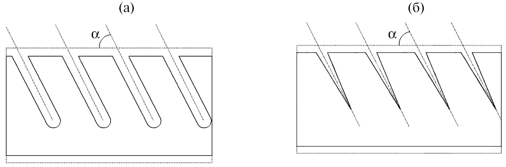 Рис. 3. Формирование шероховатых поверхностей при травлении наклонного массива треков с высокой (а) и низкой (б) избирательностью травления