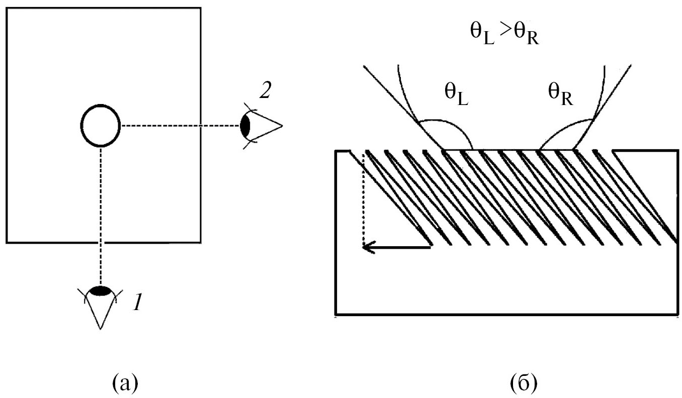 Рис. 4. а) способы измерения краевых углов, вид сверху (стрелкой указана горизонтальная проекция направления рельефа образца); б) измеряемые углы на анизотропной поверхности полимера при втором способе измерения: θL – КУ слева, θR – КУ справа
