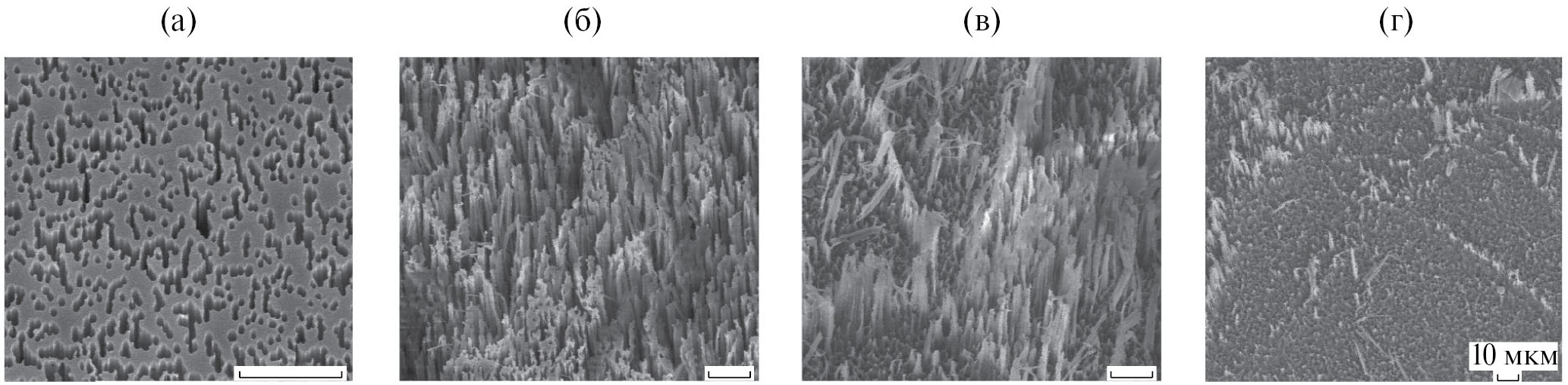 Рис. 6. Электронные фотографии микроструктурированных поверхностей, полученных при травлении поликарбоната, облученного ионами под углом 45° в течение: 10 (а), 20 (б), 30 (в) и 40 (г) мин. Размер масштабной черты 10 мкм (а–г)