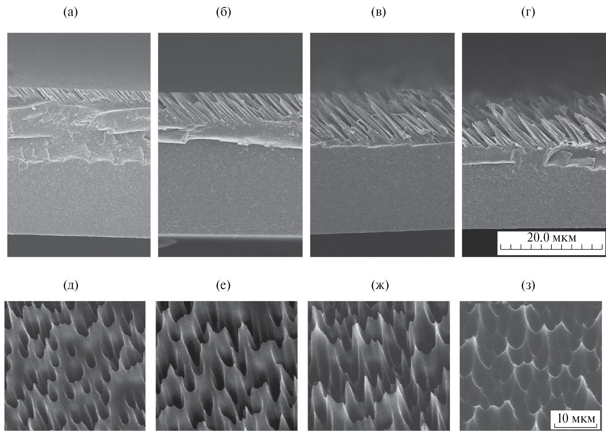 Рис. 9. Электронные фотографии микроструктурированных поверхностей, полученных травлением полипропилена, облученного под углом 45° (а–г) и 30° (д–з). Время травления: 20 (а), 30 (д), 40 (б, е), 50 (ж), 60 (в), 75 (г) и 80 (з) мин. а–г) изображения сколов; д–з) фронтальные поверхности. Размер масштабной черты 20 мкм (а–г) и 10 мкм (д–з)