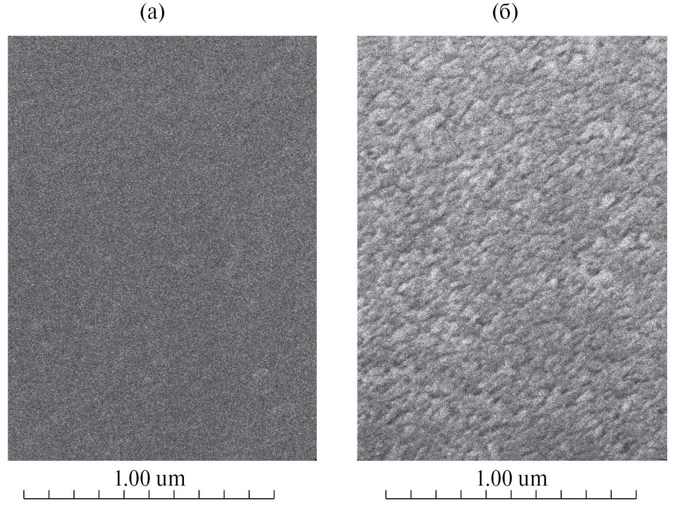 Для более полного понимания процесса смачивания рассматриваемых нами двух материалов необходимо также рассмотреть вопрос о рельефе поверхности в нанометровом диапазоне. Известно, что поликарбонат образует аморфные пленки, в то время как двухосноориентированные пленки из изотактического полипропилена характеризуются высокой степенью кристалличности. Химическое травление первых характеризуется гладким фронтом, в то время как травление вторых выявляет кристаллические и аморфные домены, типичный масштаб которых составляет 20–30 нм [38]. Микрофотографии на рис. 10 иллюстрируют упомянутые особенности ПК и ПП. Поверхность поликарбоната лишена каких-либо неровностей, детектируемых при данном увеличении (рис. 10а), в то время как на поверхности полипропилена вскрылась нанокристаллическая структура (рис. 10б). Таким образом, получаемый методом ИТТ рельеф поверхности полипропилена имеет бимодальную шероховатость – на микрометровом уровне за счет травления треков и на нанометровом уровне за счет морфологии самого материала. Тем самым в случае ПП мы имеем аналогию с некоторыми супергидрофобными поверхностями природного происхождения [3].
