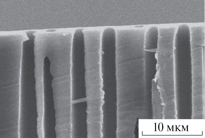 Требует обсуждения вопрос о том, почему на поликарбонате с углом смачивания <90° вода не проникает в глубину между элементами рельефа в широком интервале значений f, причем это состояние оказывается достаточно стабильным (десятки мин). Нельзя полностью исключить некоторой гидрофобизации поверхности неконтролируемыми загрязнениями из окружающего воздуха. Другим важным фактором является специфическая особенность поликарбонатных пленок, которая заключается в неоднородности по глубине. В отличие от идеализированных схем на рис. 1а и 2а, каналы пор в поверхностном слое толщиной около 2 мкм расширяются по мере удаления от поверхности. Этот эффект известен для поликарбонатных пленок различного происхождения. Он обнаруживается для пор нанометрового [44], субмикронного [34, 39] и микрометрового [45] диапазонов. На рис. 11 приведено электронно-микроскопическое изображение среза поликарбонатной пленки с низкой плотностью пор, на котором хорошо видна конфигурация входных участков каналов пор. Похожая конфигурация описана в работе [46], где наблюдали гидрофобное поведение поверхности гидрофильного материала со сферическими впадинами. Проникновение воды внутрь впадины должно сопровождаться увеличением площади поверхности мениска, что механически невыгодно. Возможность формирования гидрофобных и даже супергидрофобных поверхностей на материалах с углом θ0 < π/2 и свойства рельефа, необходимые для достижения этих эффектов, были описаны ранее в работе [47]. Более подробные теоретические обоснования можно найти в оригинальных работах и обзорах [48–51]. Экспериментальные подтверждения получены в работах [52, 53]. Последний пример особенно интересен тем, что посвящен исследованию свойств лотоса: для гладкой поверхности вещества, покрывающего его листья, найдено значение θ0 = 74.0 ± 8.5°. Таким образом, формирование водоотталкивающих свойств изначально гидрофильной поверхности за счет специфического рельефа – явление известное, природа которого состоит в том, что эти свойства термодинамически неравновесны [47].