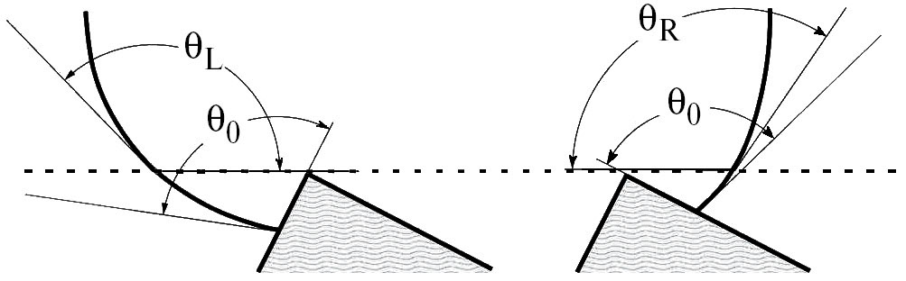 Природа анизотропии на поверхностях с наклонными элементами рельефа может быть качественно объяснена в рамках имеющихся представлений и изложенных, например, в [55]. На рис. 12 представлена схема формирования асимметричной капли, достаточно малой, чтобы пренебречь силами гравитации. Прохождение линии трехфазного контакта по наклонным элементам рельефа приводит к тому, что при одинаковых истинных углах смачивания на левой и правой гранях острий (θ0) кажущийся макроскопический угол смачивания относительно горизонтальной поверхности принимает разные значения (θL и θR на рисунке).