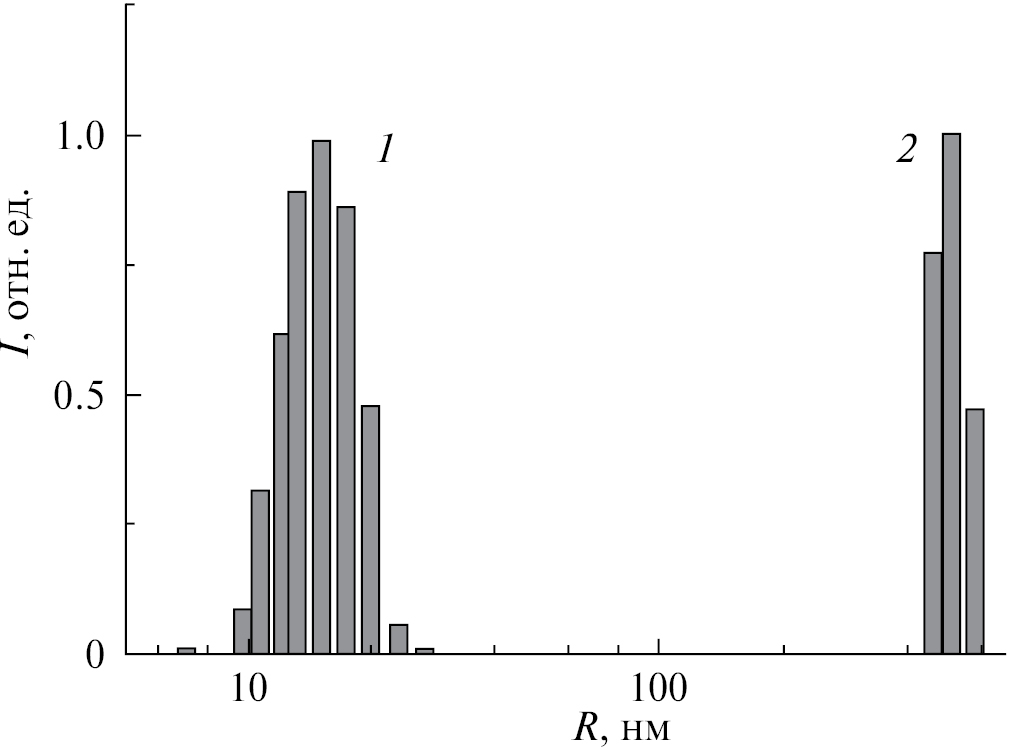 Затем в виалу добавляли 15 микролитров соляной кислоты в качестве коагулянта. Процедуру ДРС измерений начинали через 2–5 секунд необходимых для приведения прибора в рабочее состояние. Каждое измерение гистограммы распределения кластеров НЧЗ по радиусам занимало 10–20 секунд. За время процесса агрегации таких гистограмм было построено более 20. На рис. 2 под индексом 2 представлена гистограмма, полученная на конечном этапе агрегации. Промежуточные гистограммы не приводятся, чтобы не загромождать рисунок.