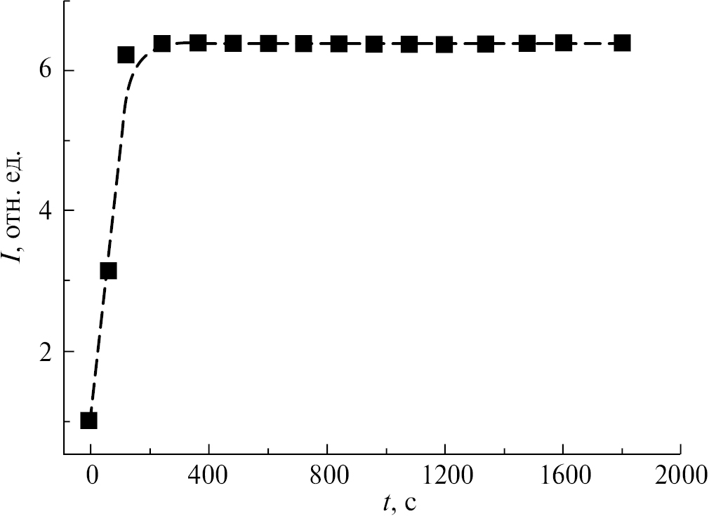На рис. 4 приведена кинетика изменения нормированной интенсивности светорассеяния I(q, t) коллоидного раствора НЧЗ в процессе его агрегации. Из приведенного графика видно, что на начальном этапе агрегации имеет место резкое усиление сигнала светорассеяния более чем в 6 раз. В дальнейшем интенсивность светорассеяния остается постоянной на протяжении всего процесса агрегации.