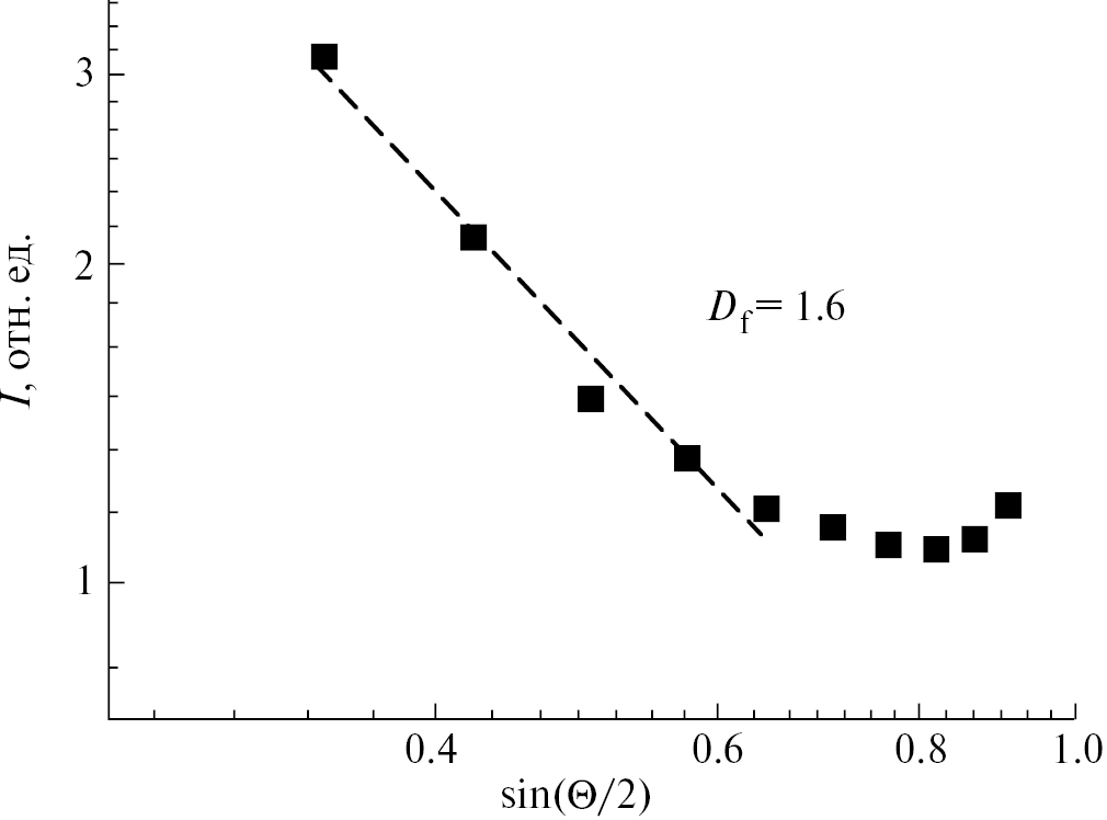 На рис. 6 представлена угловая зависимость интенсивности светорассеяния коллоидным раствором золота, полученная на конечном этапе его агрегации (Rk ≈ 500 нм). Согласно (16), для крупных кластеров (R≫q–1), тангенс угла наклона линейной аппроксимации экспериментальных данных I(q) (рис. 6) определяет значение их фрактальной размерности Df=1.6. Можно сделать вывод, что фрактальная размерность кластеров в процессе агрегации НЧЗ не изменяется и составляет Df=1.6.