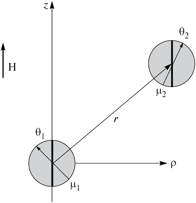 Для максимального упрощения задачи и для того, чтобы сконцентрироваться на ее принципиальных моментах, мы рассматриваем частицы как одинаковые сферы с магнитными моментами mi = µim (|µi| = 1;i = 1,2) и диаметром dp соответственно; объемную концентрацию частиц в системе обозначим . Опыт показывает, что обычно парное приближение и предположение о пространственно однородном расположении частиц оправданы, когда объемная концентрация находится в пределах нескольких процентов (вплоть до десяти процентов), а энергия магнитного взаимодействия частиц не превосходит несколько единиц тепловой энергии kT. Мы будем предполагать выполнение этих условий.