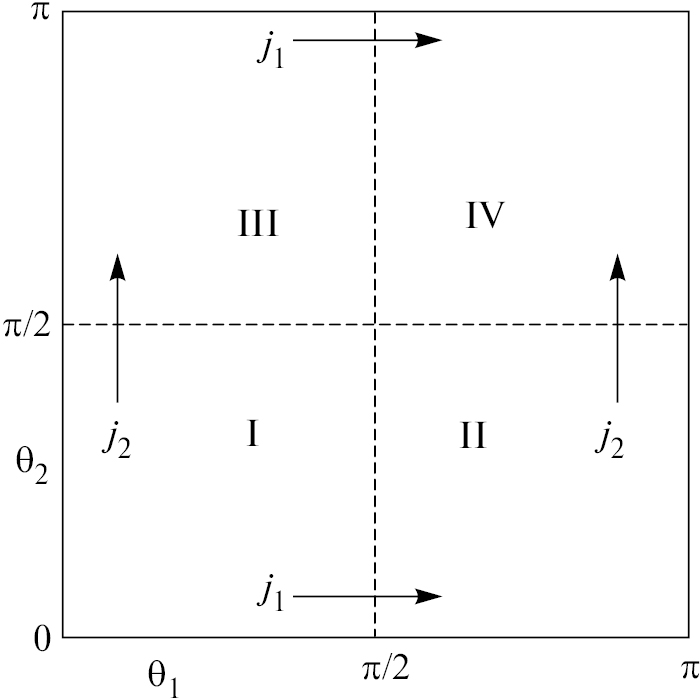 Рис. 2. Схематическая карта состояний пары частиц в плоскости (θ1,θ2). Внутренние штриховые линии приближенно иллюстрируют барьеры между потенциальными «долинами» с локальными минимумами (8). На карте j1,2 – плотности потоков вероятности перехода системы через потенциальные барьеры между потенциальными долинами. Стрелки иллюстрируют направления этих потоков.
