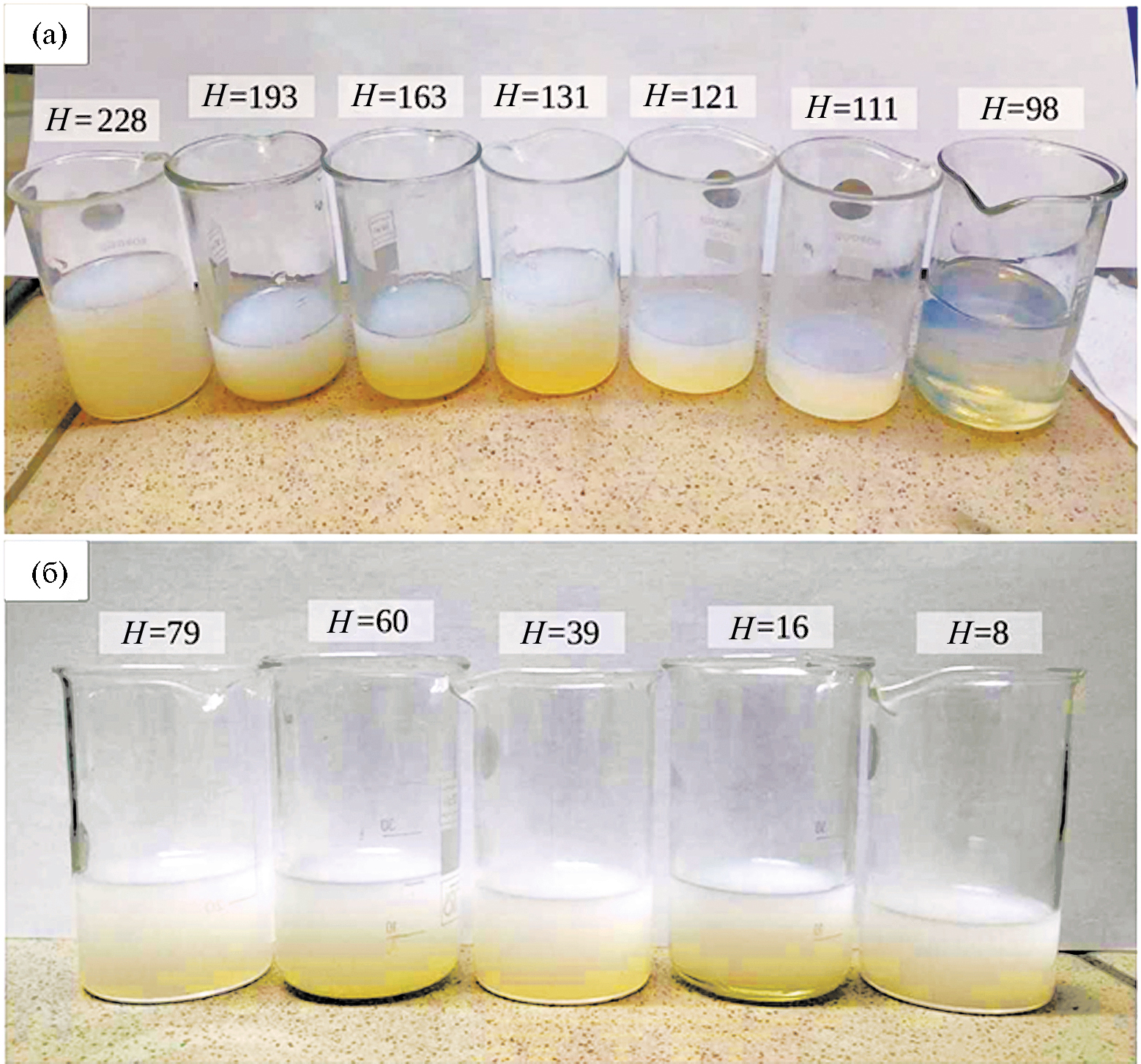 Рис. 5. Внешний вид гелей: МЭ + H2Oдист (а). Слева направо: Н = 228, 193, 163, 131, 121, 111, 98; УК + ЭГ (б). Слева направо: Н = 79, 60, 39, 16, 8.