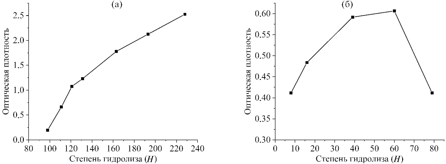 После добавления осаждающего агента наблюдается характерное изменение оптической плотности (рис. 3). В случае использования МЭ в качестве дисперсионной среды и воды – в качестве осаждающего агента (рис. 3а) наблюдалось достаточно резкое возрастание оптической плотности спустя небольшое время после прибавления осаждающего агента с последующим выходом временной зависимости оптической плотности на плато. Для пары УК + ЭГ наблюдался индукционный период (около 5–10 минут), в течение которого оптическая плотность системы практически не возрастала, и далее повышение по линейной зависимости от времени. Стоит также отметить практически одинаковые значения оптической плотности при Н = 39 и Н = 60, а также заметное снижение при дальнейшем повышении Н. Возможные причины наблюдаемого явления будут обсуждены ниже.