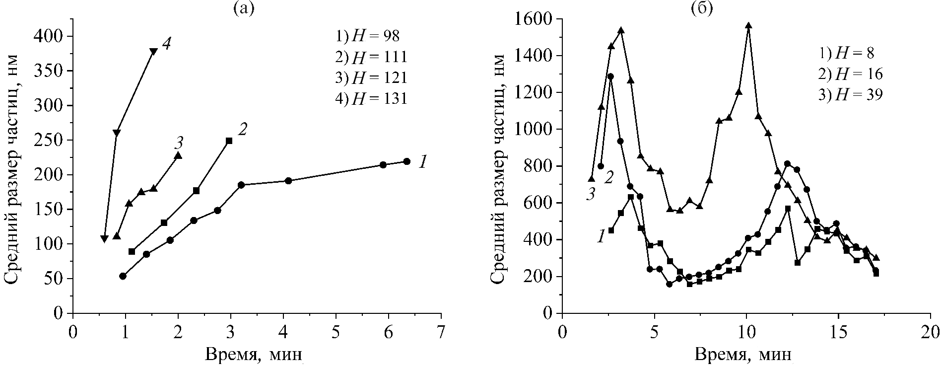 Рис. 7. Изменение средних размеров частиц в процессе гелеобразования золя-прекурсора ЦТС, полученного золь–гель методом на основе различных дисперсионных сред и осаждающих агентов: МЭ + H2Oдист (а), УК + ЭГ (б). Значения Н приведены в поле рисунков.