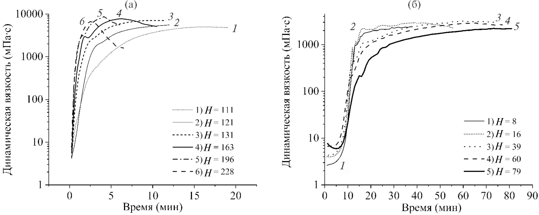 Рис. 8. Изменение динамической вязкости в процессе гелеобразования золя-прекурсора ЦТС, полученного золь-гель методом на основе различных дисперсионных сред и осаждающих агентов: МЭ + H2Oдист (а), УК + ЭГ (б). Значения Н приведены в поле рисунков.