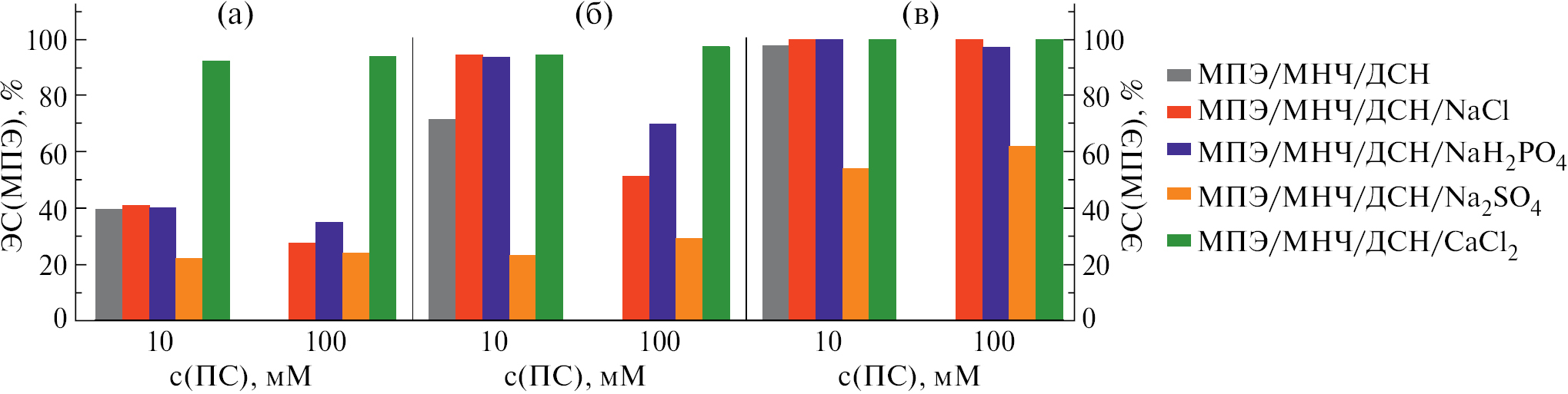 Рис. 3. Зависимость эффективности магнитной сепарации МПЭ из водных суспензий МПЭ/МНЧ/ДСН/ПС от концентрации природных солей, с(МНЧ) = 0.005 г/л (а), 0.01 г/л (б), 0.05 г/л (в), с(ПС) = 10 и 100 мМ; с(ДСН) = 3 мМ. Длительность предварительной выдержки t = 30 минут, длительность магнитной седиментации τ = 15 минут.