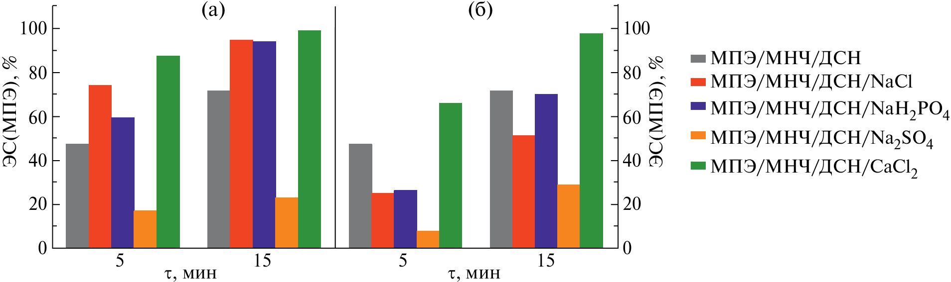 На рис. 5 показаны зависимости эффективности магнитной сепарации МПЭ из водных суспензий МПЭ/МНЧ/ДСН/ПС от длительности магнитной седиментации τ при с(МНЧ) = 0.01 г/л (эксперимент 5, табл. 1). Увеличение τ приводит к повышению ЭС(МПЭ) при изученных концентрациях солей (рис. 5). Однако увеличение концентрации солей NaCl, NaH2PO4 до 100 мМ приводит к снижению ЭС(МПЭ) по сравнению с суспензиями без солей. Наиболее эффективно сепарация протекает в присутствии соли CaCl2 (ЭС = 98%) и наименее эффективно в присутствии соли Na2SO4 (ЭС = 30%).