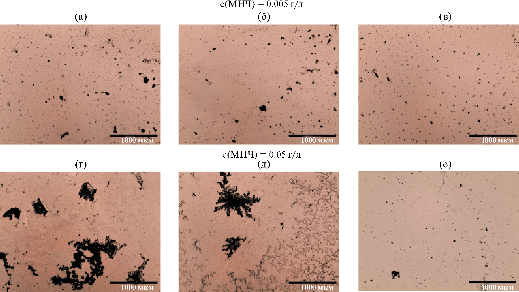 На рис. 6 представлены микрофотографии суспензий МПЭ/МНЧ/ДСН/NaCl с разными концентрациями МНЧ 0.005 и 0.05 г/л без предварительной выдержки (а, г) и после предварительной выдержки в течение 30 минут (б, д), соответственно. Повышение концентрации МНЧ приводит к формированию более крупных агрегатов частиц в суспензии и последующему более быстрому их оседанию в магнитном поле. Видно, что остаточная концентрация частиц существенно меньше в суспензии с более высокой концентрации МНЧ (рис.6в, е).
