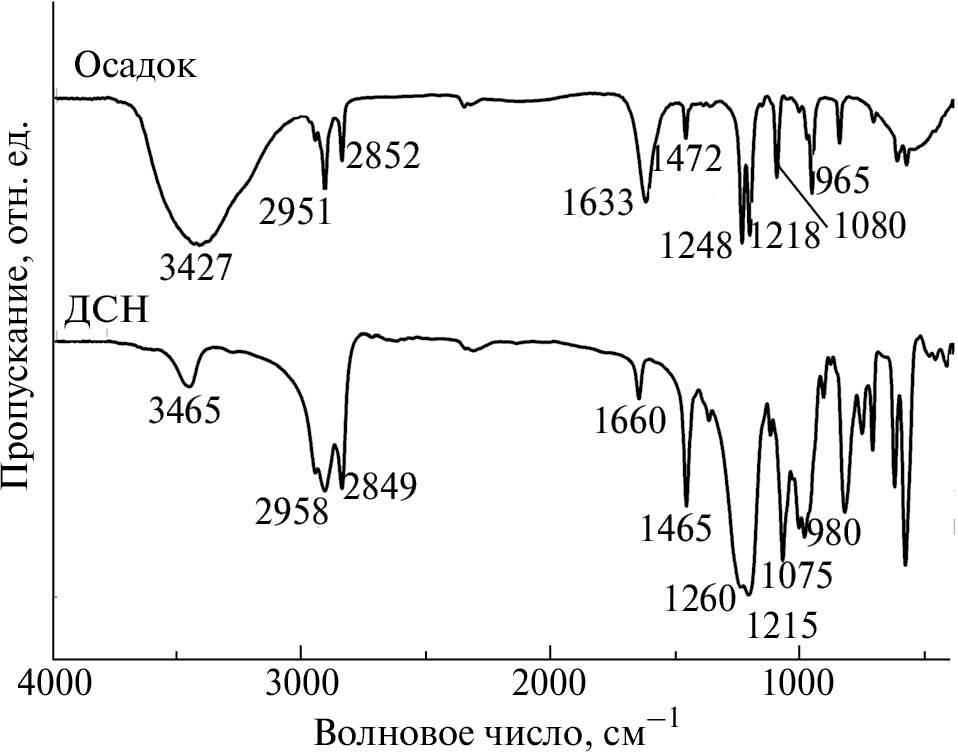 Рис. 7. ИК-спектры сухого осадка, полученного из водной суспензии ДСН/СаCl2 и порошка ДСН, с(CaCl2) = 100 мМ, с(ДСН) = 3 мМ.