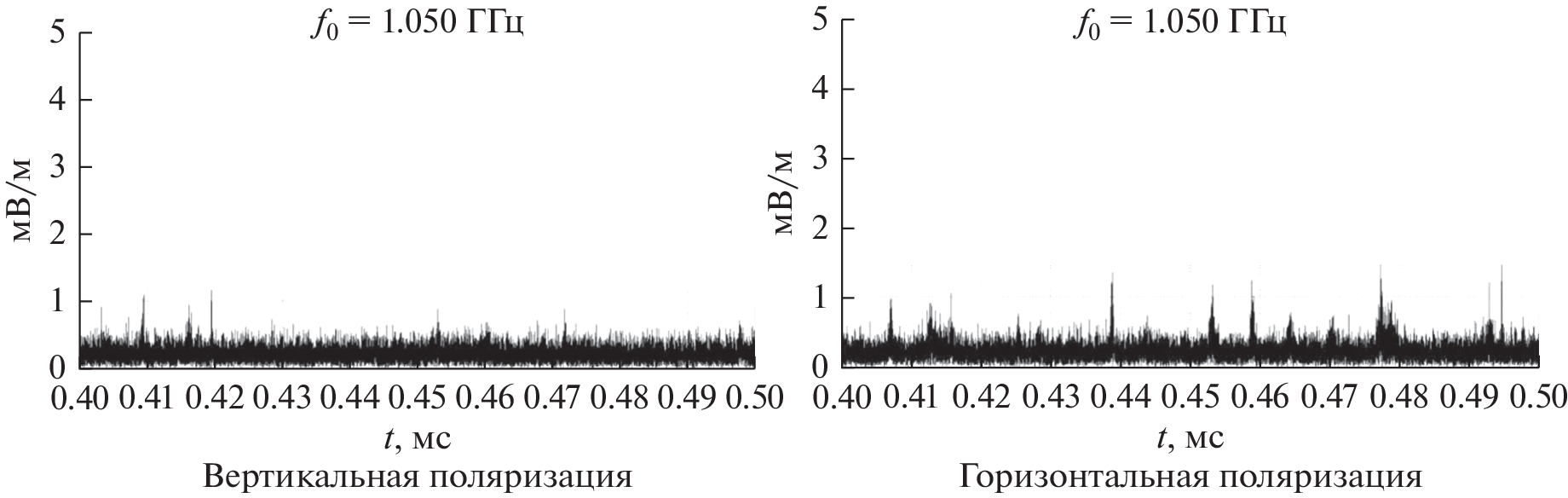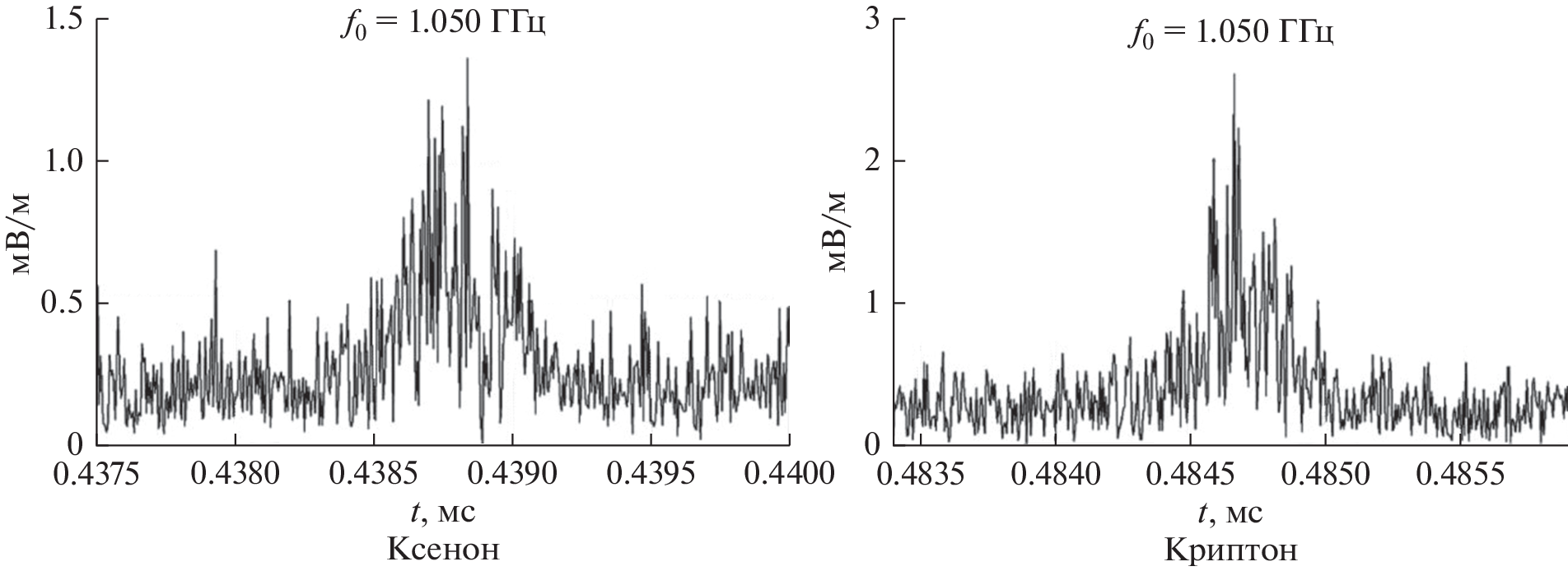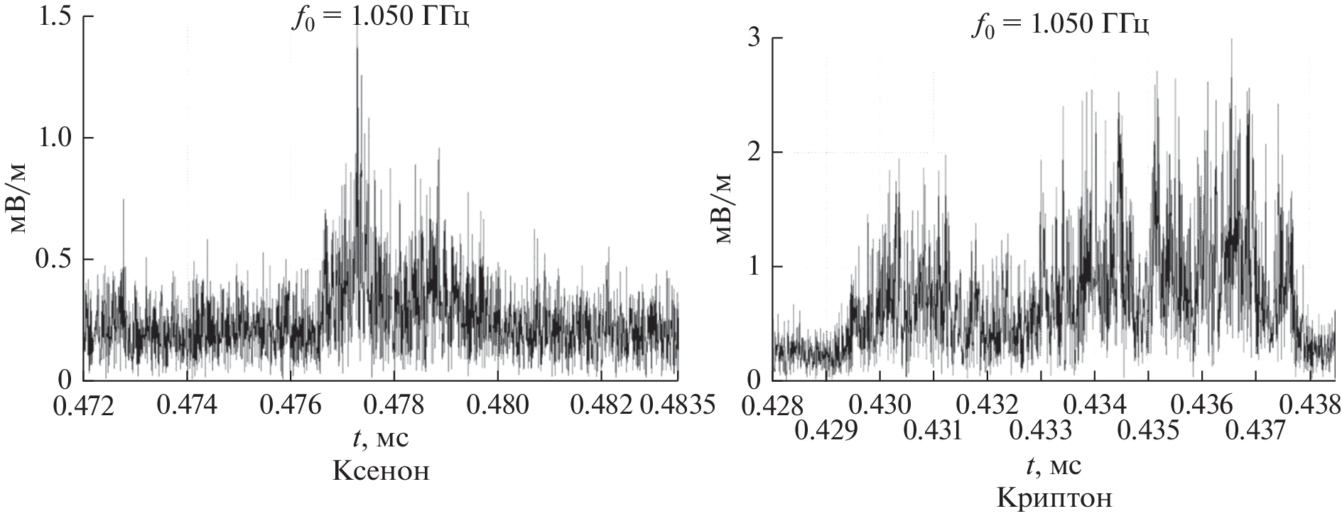Possible aspects of violation of the functional safety of spacecraft in terms of electromagnetic compatibility with electric rocket thrusters in their work on alternative working substances are considered. The procedure of experimental determination of spectral–time characteristics of own electromagnetic radiation of laboratory model of stationary plasma thruster SPT-70 developed by the Research Institute of Applied Mechanics and Electrodynamics of the Moscow Aviation Institute is described. Measurements of noise emissions were carried out on a vacuum installation with a “radiotransparent” compartment and a shielded echo-free camera in the frequency range of 1–12 GHz for typical discharge capacities (600, 800, and 1000 W), vertical and horizontal polarization, and various working substances used (krypton and xenon). The conducted studies have allowed obtaining new comparative results of the assessment of spectral characteristics of SPT-70 radiation for standard modes and prospective working bodies within the orthogonal polarization bases. The new results should include information about the radiation characteristics of SPT-70 in the time area. It is shown that the transition from xenon to krypton retains the pulsed nature of the radiation of a stationary plasma thruster, leading not only to an increase in the amplitude of pulses, but also to an increase in the frequency of repetition of “bursts” and an increase in their duration, which requires additional measures to ensure electromagnetic compatibility in order to preserve the functional safety of the spacecraft.