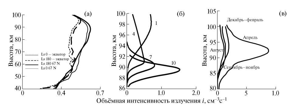 На рис. 3 показаны рассчитанные высотные распределения объемных интенсивностей излучения полос Герцберга I, связанных со спонтанным переходом A3Σu+(v' = 6) → X3Σg–(v" = 3) (1) на северных широтах (67° N) и в экваториальной зоне Марса для точек весеннего и осеннего равноденствия (рис. 3а), на средних широтах Земли (55.7° N) для 1, 4, 7, 10 месяцев 1980 и 1981 гг. (рис. 3б), в экваториальной зоне и в северных тропиках Земли (23° N) для зимнего, весеннего, летнего и осеннего периода (рис. 3в). По осям X приведены значения объемной интенсивности излучения i(см–3c–1), по осям Y отложены высоты в километрах. Как видно из рис. 3а, для атмосферы Марса наблюдается значительный разброс значений объемных интенсивностей излучения полосы Герцберга I в отличие от значений абсолютных концентраций атомарного кислорода, что объясняется вариациями температуры в зависимости от широты.