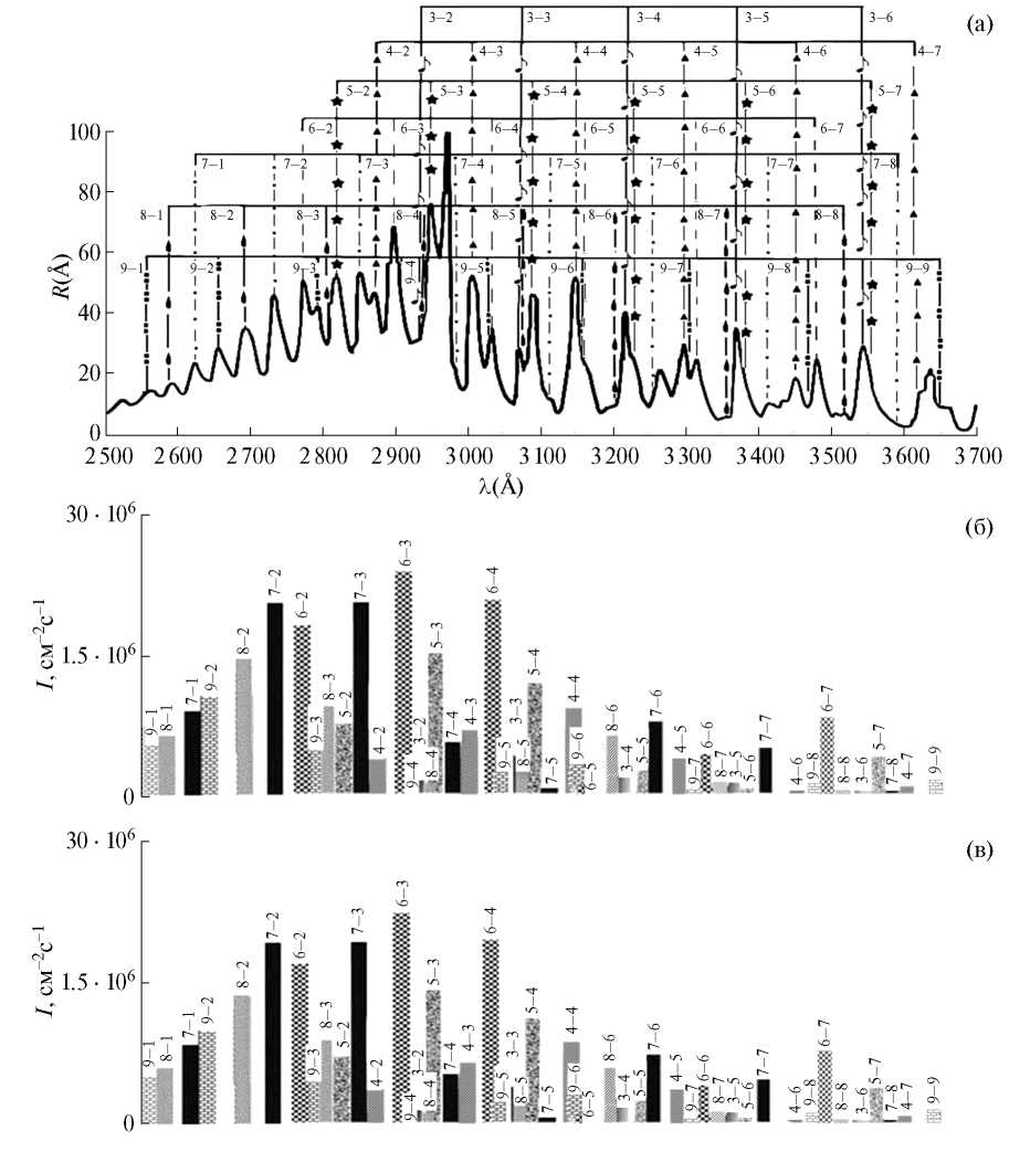 На рис. 4а и 5а представлен фрагмент усредненного спектра свечения ночного неба в диапазоне 250–370 нм, измеренного спектрографом с космического шаттла «Дискавери» (STS-53) в интервале от 115 до 900 нм на протяжении его 7-дневной миссии в декабре 1992 г. [3]. По осям Y отложены значения интенсивностей в рэлеях/ангстрем (R/Å) (1 Р = 106 фотон/см2с), по осям X отложены длины волн в ангстремах (λ(Å)). Каждая двойка цифр над пиками свечения обозначает колебательные уровни (v'–v") при излучательном переходе (1).