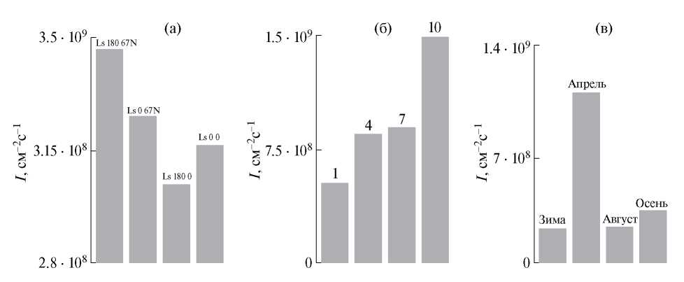 Кроме того, на рис. 6а представлены рассчитанные значения общей интегральной светимости всей рассмотренной системы полос Герцберга I в диапазоне 250–370 нм (I, см–2с–1, гистограммы): для атмосферы Марса для широты 67° N и экватора во время осеннего и весеннего равноденствий северной широты, Ls ~180o и Ls ~0o (рис. 6а). Результаты расчетов показали, что максимальные значения ~0.34 кР общей интегральной светимости для рассмотренных четырех случаев атмосферы Марса наблюдаются в точке осеннего равноденствия на северных широтах (Ls ~180o, 67° N).