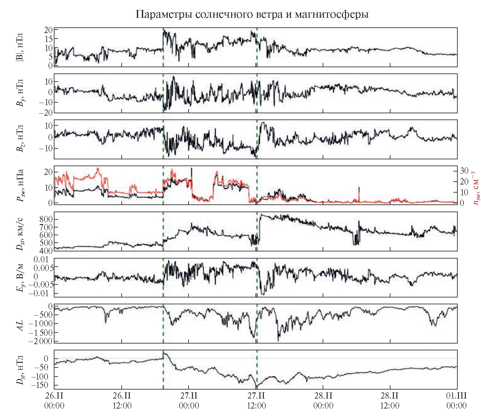 Корональные выбросы массы от солнечных вспышек достигли Земли в ночь с 26 на 27 февраля. В базе данных OMNI (https://omniweb.gsfc.nasa.gov) отсутствуют данные с 01:00 до 11:00 UT 27 февраля, поэтому мы использовали данные SWX (https://swx.sinp.msu.ru/). Как видно на рис. 1, по данным SWX наблюдалось два сильных скачка давления солнечного ветра. Первый начался примерно в 19:25 UT 26 февраля. Его начало совпало с усилением отрицательной компоненты By с –2 до –15 нТл и с поворотом ММП от северного направления к южному. При этом скорость солнечного ветра резко возросла от ~460 до ~550 км/с, а плотность nsw – с 10 до 20 частиц в см–3, что вызвало сильную магнитную бурю. Эти скачки скорости и плотности определили скачок динамического давления солнечного ветра Psw от примерно 3 до 10 нПа. Затем скорость солнечного ветра начала плавно возрастать с ~550 до ~700 км/с, а плотность – до 30 частиц в см–3. Второй скачок давления солнечного ветра начался примерно в 04:00 UT 27.II.2023 одновременно со скачком плотности от 3 до 18 частиц в см–3 при практически постоянной скорости ~620 км/с и южном ММП. В середине дня 27 февраля скорость солнечного ветра превысила 850 км/с.