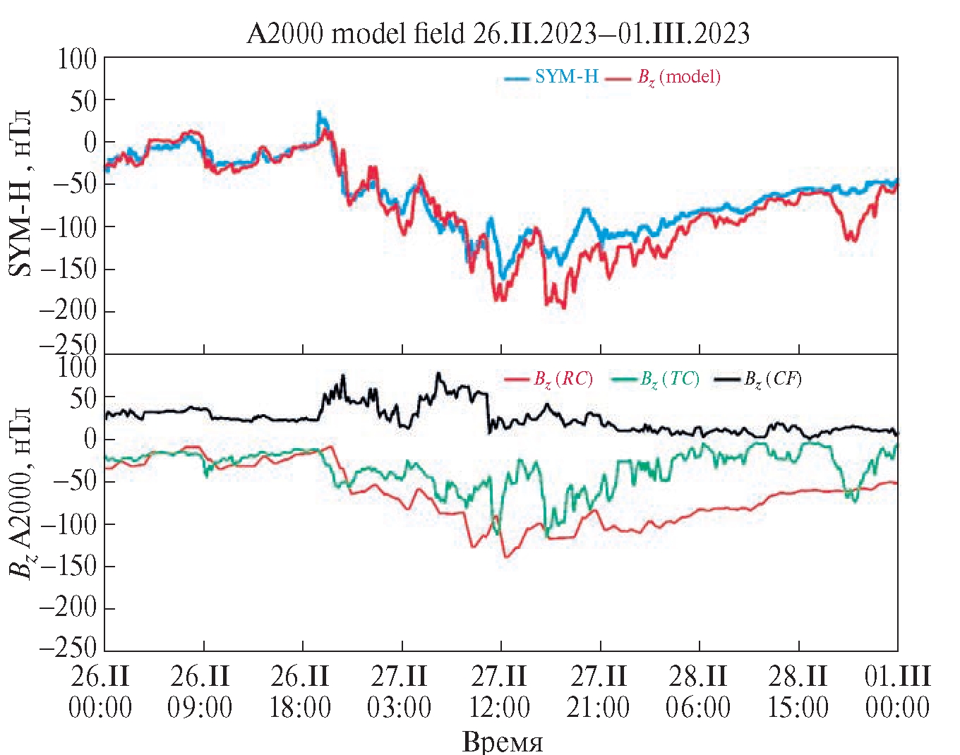 Для описания магнитной бури 26–28.II.2023 выбрали параболоидную модель магнитосферы A2000. В ней магнитосферное магнитное поле состоит из двух слагаемых. Первое порождается внутриземными токами, второе – токами, текущими в магнитосфере. Внутриземное магнитное поле вычисляется по модели IGRF 13 (http://www.ngdc.noaa.gov/IAGA/vmod/igrf.html), в которой оно представлено в виде разложения по сферическим гармоникам [16].