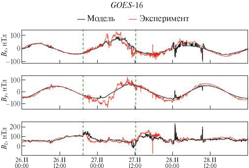 Для оценки надежности результатов расчетов по параболоидной модели сравним наблюдаемое магнитное поле со спутников GOES-16 и GOES-18 с модельным магнитным полем вдоль траектории этих КА. Результаты расчета и сравнение с измерениями представлены на рис. 7, 8.