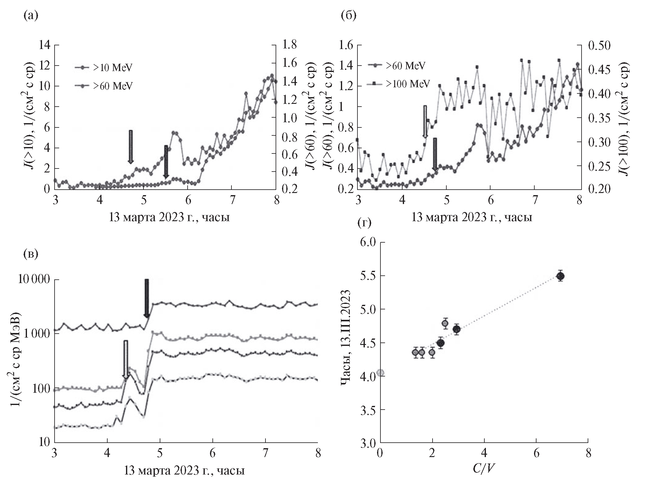 Рис. 4. Временные профили потоков протонов с энергией >10 и >60 МэВ (а), >60 и >100 МэВ (б) по данным ИСЗ GOES-16 и потоков электронов с энергиями 0.038–0.053, 0.053–0.103, 0.103–0.175 и 0.175–0.315 МэВ (в) по данным КА ACE 13.III.2023 (стрелками указаны моменты первого прихода частиц). Зависимость (г) времени прихода частиц в околоземное пространство от скорости частиц (протоны – темные значки, электроны – более светлые). Значок на оси Y – экстраполяция полученной зависимости для оценки момента выхода частиц из Солнца в межпланетную среду.