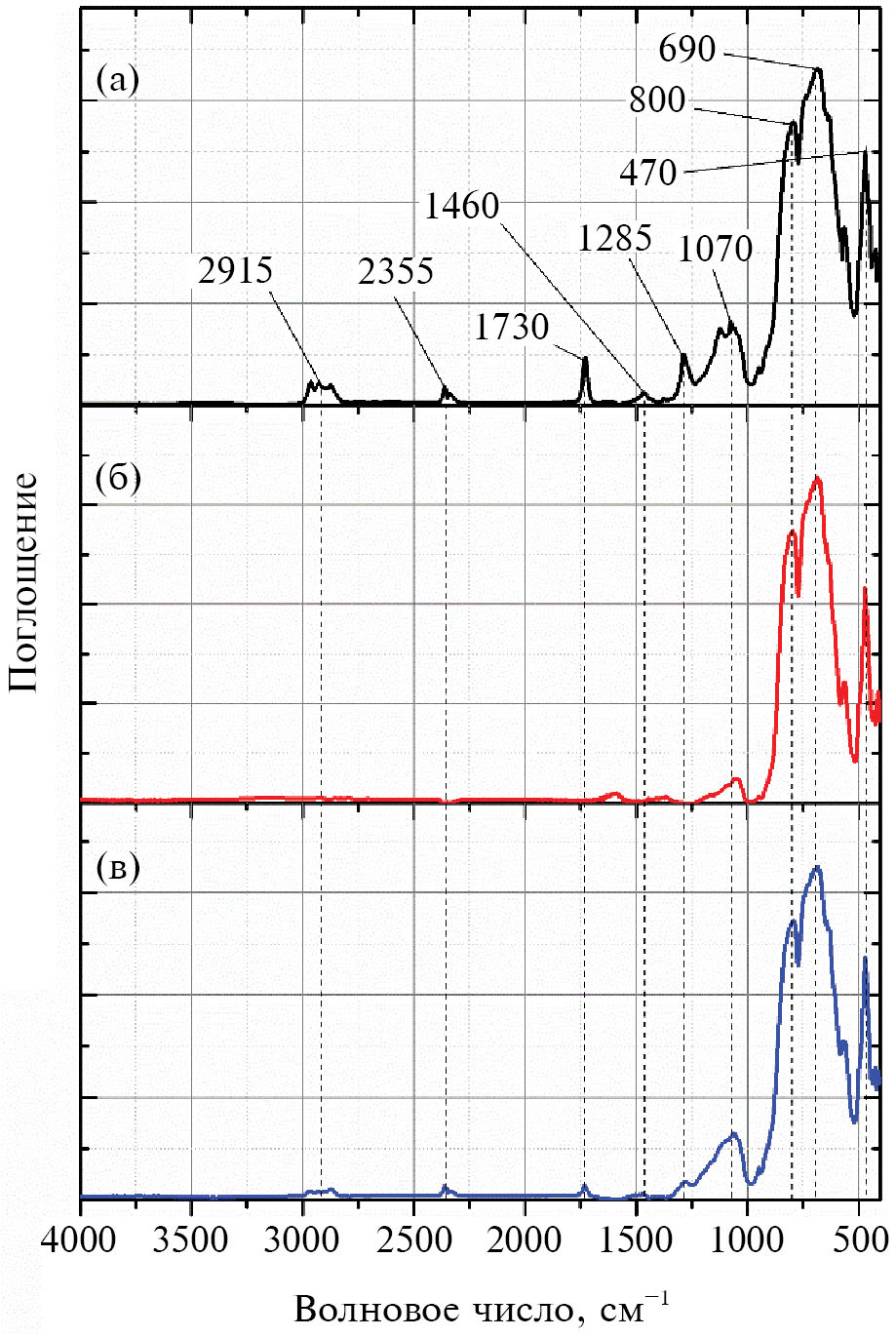 Рис. 1. ИК-спектры поглощения диэлектрической пасты: сырой (а); после 15 мин высушивания при 150 °C (б); после отжига в течение 10 мин при 850 °C (в)