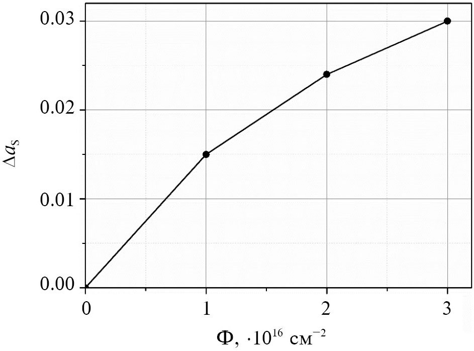 Рис. 4. Зависимость изменений коэффициента поглощения (∆as) ТРП, изготовленного из пасты ДКП, от флюенса при облучении электронами с энергией 30 кэВ