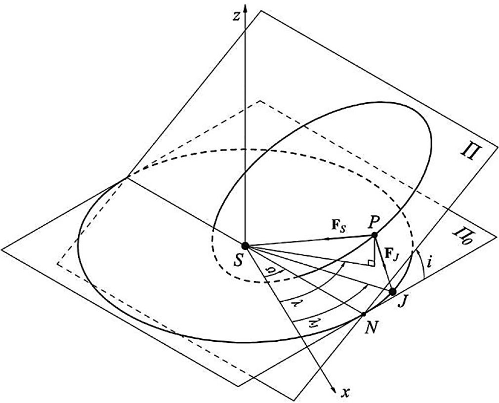 Рассмотрим круговую пространственную ограниченную задачу трех тел. Предположим, что пассивно гравитирующее тело P (спутник) находится в гравитационном поле двух массивных тел, движущихся друг относительно друга по круговой орбите радиуса rJ; центральное тело S (Солнце) имеет массу mS и воздействует на спутник с силой FS; второе тело J (Юпитер) массы mJ оказывает возмущающее действие с силой FJ. Считаем, что невозмущенная траектория точки P есть кеплеровский эллипс с фокусом в S, плоскость которого П образует с плоскостью движения П0 притягивающих тел угол i (рис. 1).