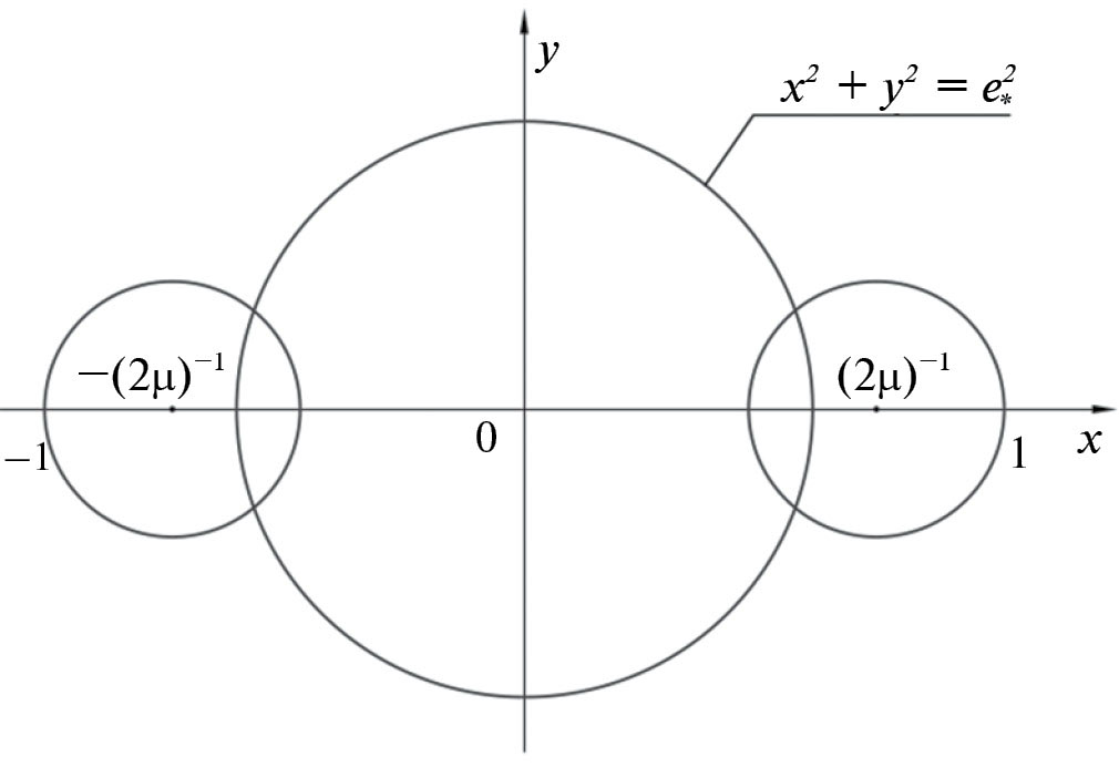 Эти рассуждения Цейпеля можно дополнить следующими выводами. При μ ≤ 1/2 две окружности (18) не имеют пересечений с кругом (19) для любых значений c1 ∈ [0, 1]. При μ > 1/2 в области e∗ ≥ (μ−1 − 1) возможны пересечения орбит: круг (19) содержит две симметричные дуги окружностей (18) (рис. 3).