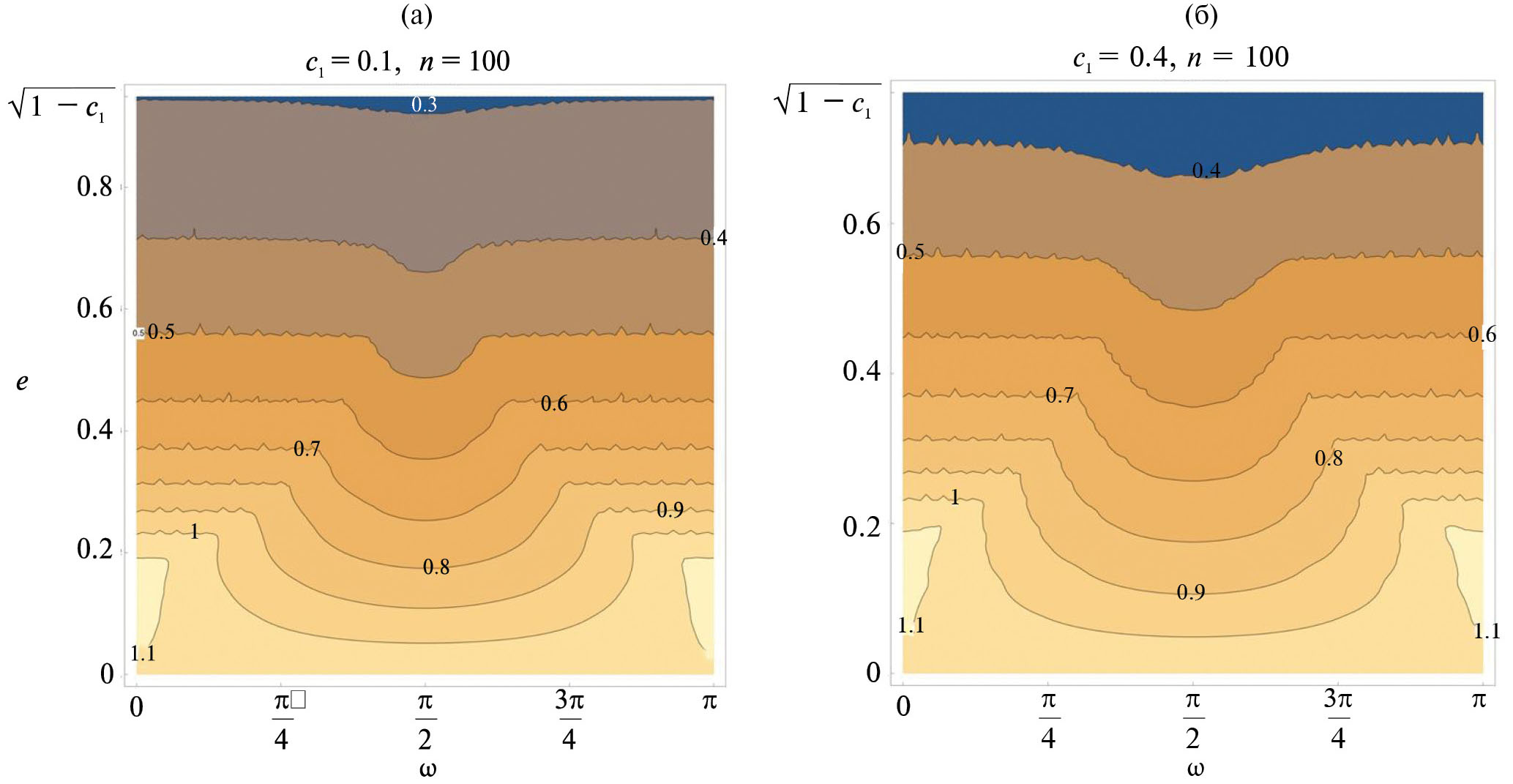 задает радиус сходимости ρ степенного ряда с коэффициентами Dn. Коэффициенты ряда (12) громоздки, поэтому его радиус сходимости строим численно. Учитывая, что коэффициенты Dn зависят от параметров e, ω, область изменения этих параметров , 0 ≤ ω < π покрываем сеткой с шагом по e и π / 100 по ω. Расчеты проводили в Wolfram Mathematica, когда радиус сходимости ρ аппроксимировался выражением . Поверхность ρ = ρ (e, ω, c1) имеет сложный вид, поэтому строим изолинии этой поверхности в плоскости ее аргументов при фиксированных значениях константы c1 = 0.1; 0.4 (рис. 4):
