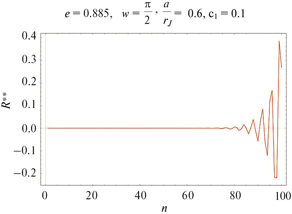 Из рис. 2 видно, что функция R∗∗ выходит на свое значение в фиксированной точке, начиная с частичной суммы, содержащей 12 членов ряда (коричневая кривая), в то время как результат численного интегрирования представлен в виде колебаний вплоть до n = 20 (синяя кривая), с последующим выходом кривой на значение функции в той же точке. Показано, что при n ≥ 20 результаты расчетов по формуле (11) совпадают с результатами численного интегрирования R(int) на сетке значений e ∈ [0, 0.9] с шагом 0.1, (a / rJ) ∈ [0.5, 0.95] с шагом 0.05, ω ∈ [0, π] с шагом π / 6, i ∈ [−π / 2, π / 2] с шагом π / 6.