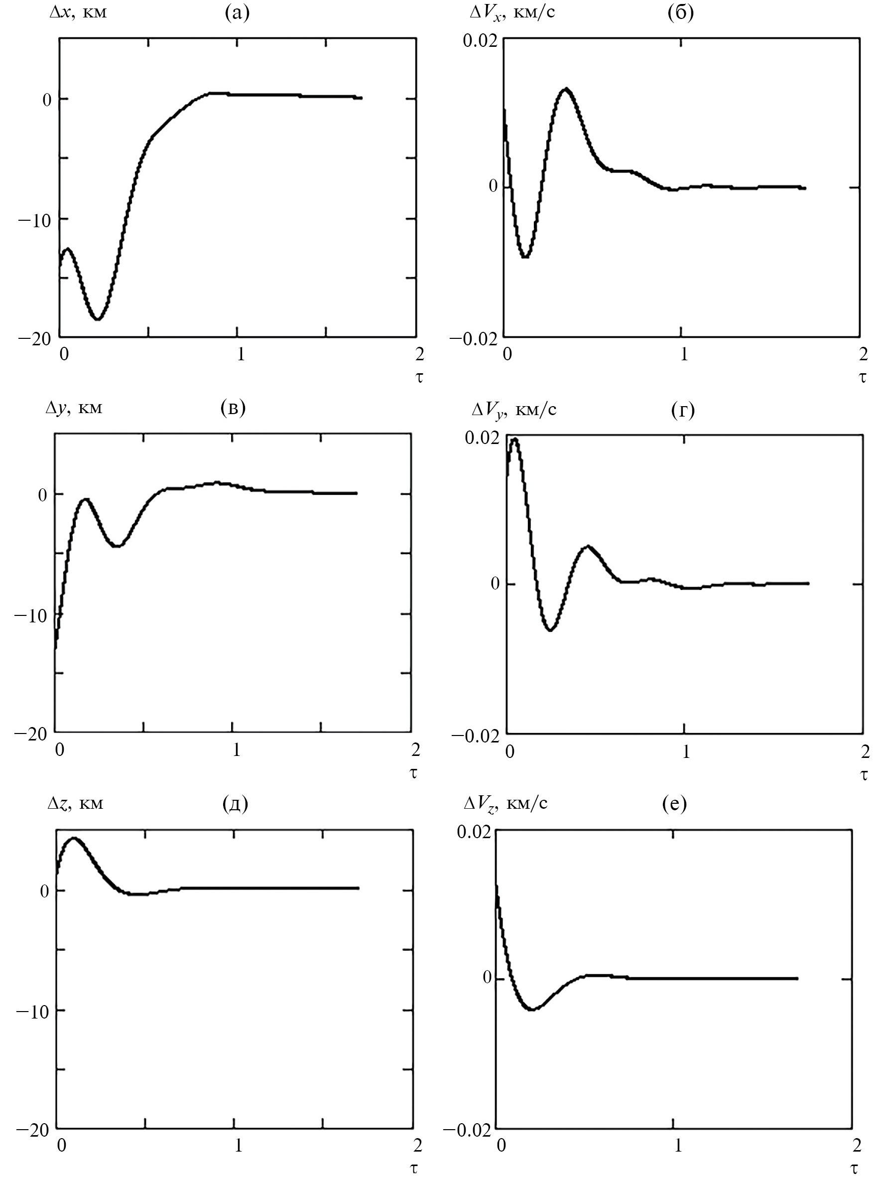 В качестве численного примера рассматривается переход между эллиптическими орбитами, причем плоскости орбит активного и пассивного КА не совпадают, что обуславливается различием их наклонений Δi = i – id и значений долготы восходящих узлов ΔΩ = Ω – Ωd. Отличаются также положения линий апсид Δω = ω – ωπd. Исходные данные для численного моделирования перехода активного КА на промежуточную орбиту приводятся в таблице. Все параметры промежуточной орбиты совпадают с параметрами орбиты пассивного КА, кроме большой полуоси, которая на ΔA < 0, т. е. начальная орбита активного КА является более низкой по сравнению с орбитой НКО. Весовые коэффициенты для управления были приняты (табл.), т. е. критерий оптимальности (5) в этом случае близок критерию, который доставляет минимум затрат на управление. Поэтому переход на промежуточную орбиту занимает достаточно большое время tf = 1.7Td, где Td — орбитальный период НКО. Здесь необходимо отметить, что если положить D = 0, то решение уравнения Риккати (7) при A(tf) = 0 тривиально A = 0 и, естественно, не может быть использовано для построения управления. Что же касается соотношения для весовых коэффициентов, определяющих величину ошибок в управлении в плоскости и вне плоскости орбиты (D11, D22, D33, D44 = 0.05 и D55, D66 = 0.04), то увеличенные коэффициенты для отклонений от плоскости орбиты НКО Δz, ΔVz объясняются тем, что необходимо особенно точно (с малой погрешностью) обеспечить совмещение орбитальных плоскостей КА и НКО. Развертывание КТС в плоскости орбиты позволяет иметь дополнительную возможность с помощью изменения длины троса компенсировать неизбежно возникающие ошибки (в плоскости орбиты НКО), появившиеся на предыдущем участке движения КА, так как оценка |ΔA|, полученная ранее и зависящая от длины троса Lk, является приближенной. На рис. 2 приводятся переходные процессы, характеризующие сближение КА с фиктивной точкой, перемещающейся по выбранной промежуточной орбите, где показано изменение всех компонент вектора от безразмерного времени τ = t/Td. Здесь следует отметить, что конечные значения параметров, характеризующих отклонения от плоскости орбиты НКО, в данном случае являются малыми: |Δz| ≤ 0.7 м, |ΔVz| ≤ 10–3 м/c, что представляется необходимым условием дальнейшего движения КТС в плоскости орбиты при ее развертывании. Переходные процессы, представленные на рис. 2, определенные по линеаризованной и исходной нелинейной системе уравнений, в данном случае практически совпадают. Изменение управлений u1, u2, которые представляют собой реактивные силы в направлении трансверсали и бинормали, показано на рис. 3а, б. Так как в начальный момент сразу после включения двигателей имеет место кратковременное увеличение значений тяги (max u1 = 45 H, max u2 = 57 H), представляется возможным ввести соответствующее ограничение. На рис. 3в, г приводятся те же управления, но с учетом ограничений |u1|, |u2| < 10 H при этом свойство асимптотической устойчивости конечного состояния системы сохраняется. На рис. 3д показана проекция траектории активного КА на плоскость переходной орбиты. Траектория построена в орбитальной подвижной системе координат (отклонения Δx0, Δy0) относительно выбранной фиктивной точки (0, 0) на промежуточной орбите. Как было установлено, затраты на управление и соответственно значения критерия оптимальности (5) существенно зависят при прочих 