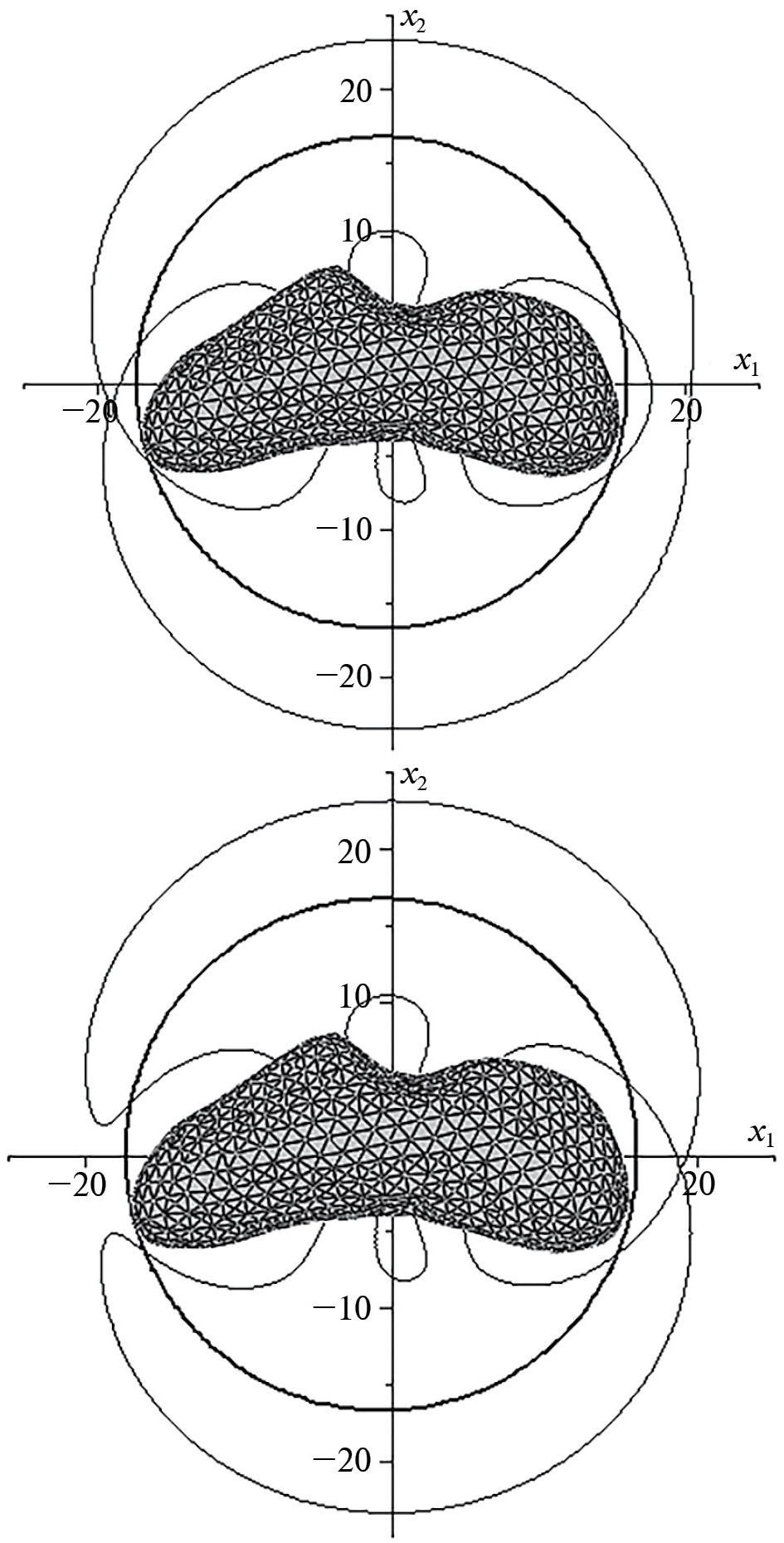 Рис. 1. Сечения поверхностей уровня плоскостями, проходящими через точки либрации E1 (сверху) и E2 (снизу) и параллельными плоскости Ox1x2 для четвертого приближения потенциала