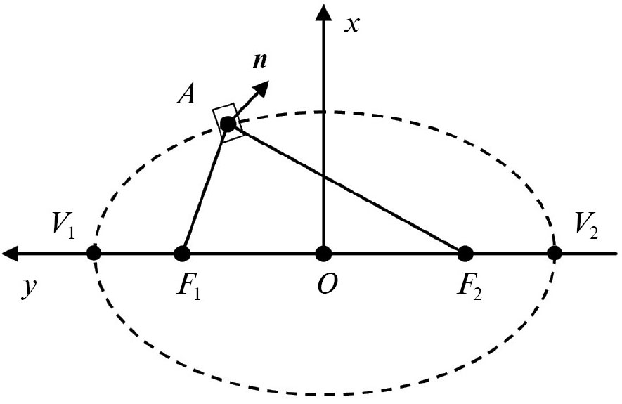 Будем изучать движение космического аппарата A массой m, оснащенного идеально отражающим плоским солнечным парусом площадью S, способного передвигаться вдоль троса длиной 2a с концами, закрепленными в точках F1 и F2, находящихся на расстоянии 2c друг от друга и принадлежащих соответственно двум тяжелым гелиоцентрическим станциям, описывающим одну и ту же орбиту. Будем предполагать, что влияние аппарата на движение станций незначительно, т. е. точки F1 и F2 неподвижны в орбитальной системе отсчета. В этом случае движение аппарата A будет ограничено эллипсоидом вращения с фокусами F1 и F2, большой полуосью a и эксцентриситетом e = c / a (рис. 1).