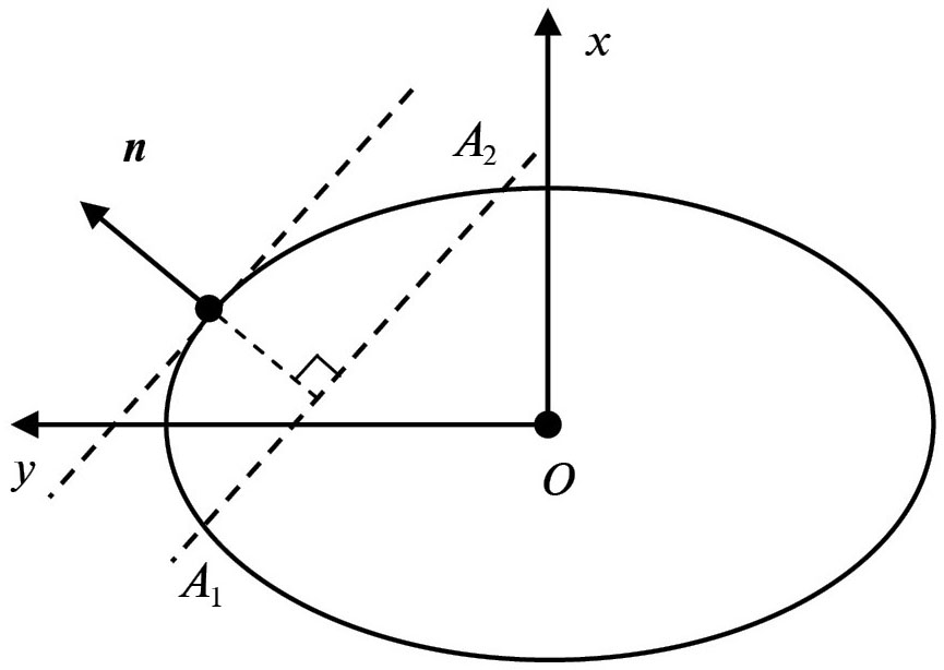 Если в условии (5) пренебречь слагаемым, содержащим ε, то такие колебания (с учетом того, что как в A1, так и в A2 относительная скорость аппарата A равна 0) будут возможны, только если в обеих точках угол между внешней нормалью к эллипсоиду (1) и нормалью к парусу n будет не более чем прямым. В то же время, если как в A1, так и в A2 этот угол будет острым и дуга A1A2 составляет менее половины эллипса (8), скалярное произведение будет положительным во всех ее точках. Из этого следует, что условием возможности колебаний по дуге A1A2 будут неравенства