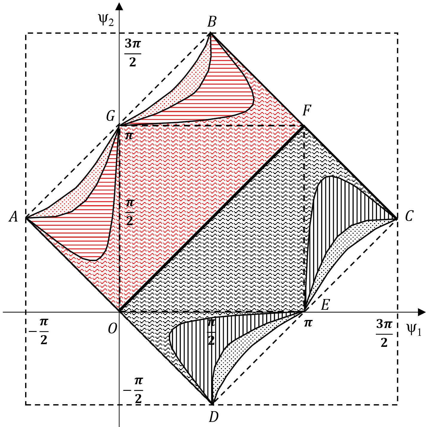 Анализируя эти условия и учитывая вышесказанное, можно установить, что искомая область при изменении e от 0 до 1 эволюционирует из квадрата ABCD в квадрат OGFE, но так, что точки A, B, C, D, G, F, E, O все время остаются на границе области (рис. 3). На этом рисунке границы области показаны для e = 0, , (когда криволинейные участки границы имеют вертикальные и горизонтальные касательные в своих крайних точках) и для . Отметим, что во всех случаях кривые AG и GB, а также кривые EC и DE симметричны относительно прямой ψ2 + ψ1 = π, в то время как кривые AG и DE, и также кривые GB и EC симметричны относительно прямой ψ1 = ψ2, т. е. кривые AG, GB, EC, DE конгруэнтны.