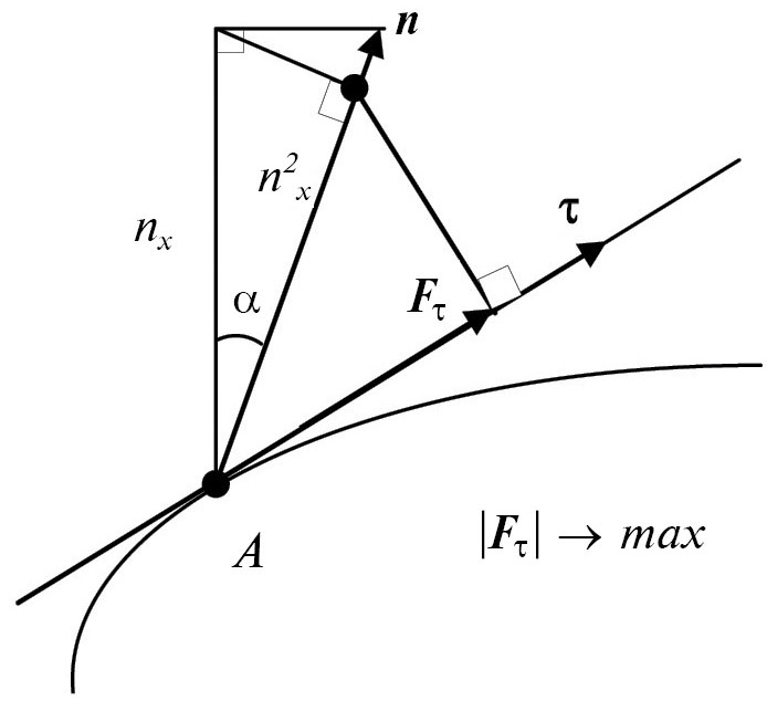 Рис. 4. Поиск максимально возможной проекции силы солнечного давления на касательную к траектории движения