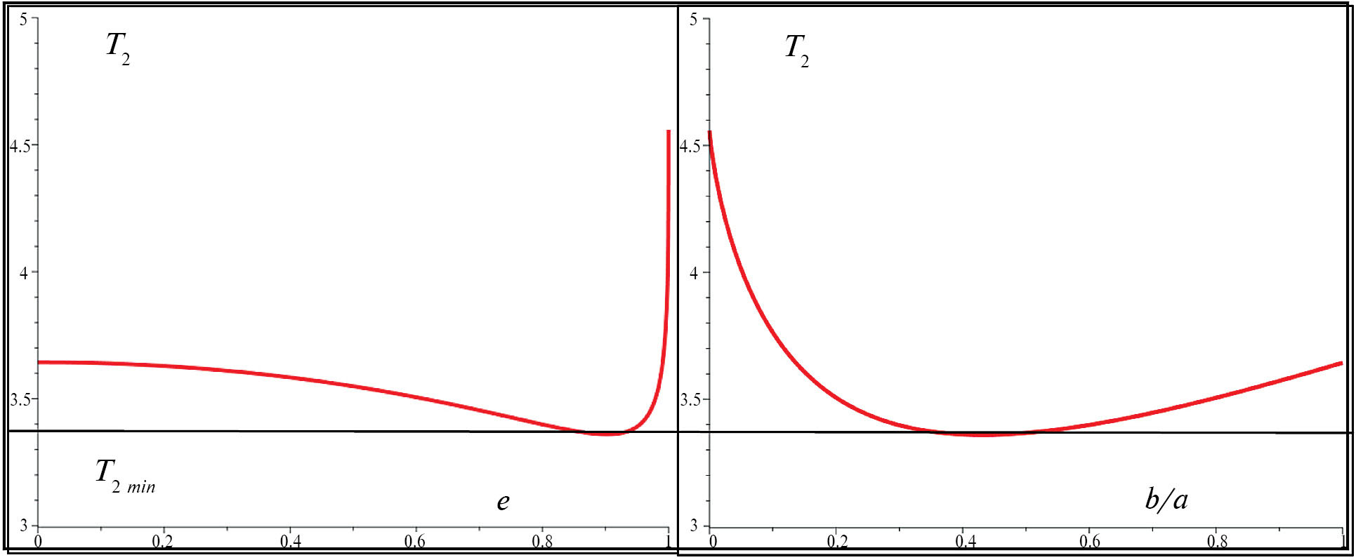Графики зависимостей T2 от эксцентриситета e и от отношения полуосей приведены на рис. 6. Минимальное значение T2 достигается при e = 0.9117 (b / a = 0.4324), причем T2min = 3.3597.