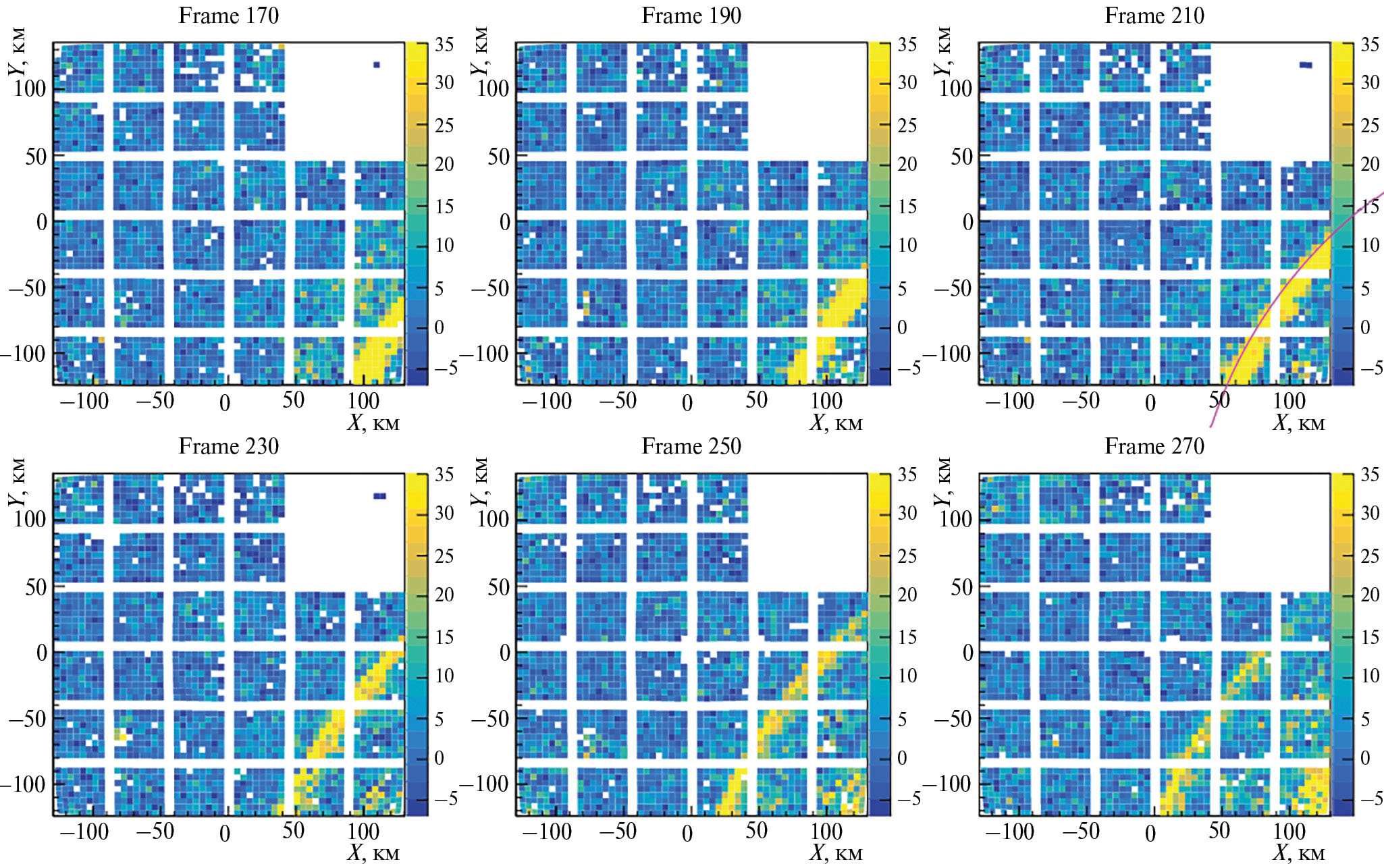 Рис. 1. Событие типа ELVES, зарегистрированное 12.V.2019. Приведены шесть мгновенных снимков (проекций на высоту 90 км) с интервалом в 20 GTU = 50 мкс. На кадре 210 розовой линией изображен результат реконструкции текущего положения фронта.