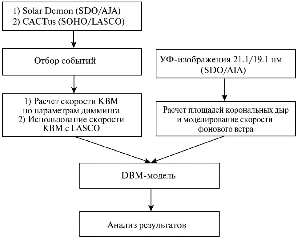 В настоящей работе сравниваются два метода прогноза, использованные для описанной выборки событий. В первом методе используются скорости КВМ, полученные из базы CACTus (далее будем называть его метод 1). Во втором методе начальные скорости КВМ рассчитаны с использованием данных о диммингах по формуле (1) (далее будем называть его метод 2). Такие события считаются распространяющимися равномерно до 20 R⊙: начальной точкой для диммингов является 1 R⊙, для КВМ – 5 R⊙. После этого скорости поступают на вход DBM-модели. Для оценки результатов прогноза проведено объединение каталогов МКВМ (https://swx.sinp.msu.ru/tools/icme_list.php). Объединенный каталог получен путем сопоставления каталога МКВМ Ричардсона и Кейн (https://izw1.caltech.edu/ACE/ASC/DATA/level3/icmetable2.htm), списка зарегистрированных у Земли МКВМ с сервиса CCMC CME Scoreboard (https://kauai.ccmc.gsfc.nasa.gov/CMEscoreboard/), каталога крупномасштабных типов солнечного ветра ИКИ РАН (отобраны типы, соответствующие КВМ) (ftp://ftp.iki.rssi.ru/pub/omni/catalog/). Всего в объединенном каталоге 404 события. Этапы моделирования отображены на рис. 2.