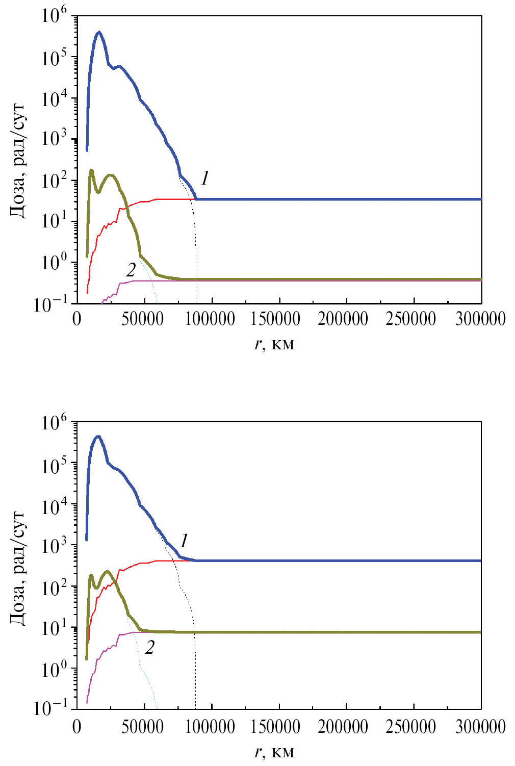 Радиационный фон формируется протонами и электронами радиационных поясов, а также потоками галактических космических лучей (ГКЛ) и солнечных космических лучей (СКЛ). Расчет проводился для минимума и максимума солнечного цикла по программе COSRAD, версия 4.3.0.5 [5]. В программе задаются параметры геоцентрической орбиты и характеристики солнечного цикла. Для расчета потоков частиц РПЗ применяется интерполяция таблиц, ранее рассчитанных по моделям AP8, AE8. Спектры частиц ГКЛ рассчитываются по динамической модели, учитывающей солнечную модуляцию. Для расчета энергетических спектров СКЛ используется вероятностная модель, которая устанавливает значения потока (в результате суммирования множества событий СКЛ) и его пиковой плотности. В данном расчете вероятность превышения расчетного потока СКЛ бралась равной 0.1. В принципе, за время полета может не быть высокоинтенсивных солнечных событий. Программа дает средний поток при заданной фазе солнечного цикла. Потоки и дозы за защитой оцениваются с использованием отдельно рассчитанных банков данных. Подробнее программа COSRAD описана в работе [5]. При расчете рассматривались различные возможные толщины защиты. На рис. 1 показана зависимость суточных доз радиации при толщинах защиты 0.01 и 1 г/см2 от радиуса орбиты. Кроме суммарных доз на рисунке показан вклад РПЗ и СКЛ. Вклад ГКЛ отдельно не показан, поскольку он многократно меньше, чем от других компонент, но учтен при расчете суммарной дозы. Чтобы описать спиральную орбиту, наигрывались банки данных для виртуальных круговых орбит, затем проводилась интерполяция с учетом времени пребывания космического аппарата на различных расстояниях от Земли. На рис. 2 показана зависимость накопленных доз от времени полета при тяге двигателя 6.5 Н. На рис. 3 – аналогичная зависимость при тяге двигателя 13 Н. На рис. 4 показана зависимость суммарной дозы радиации от толщины защиты. При увеличении толщины защиты доза быстро спадает. Причиной такого падения является то, что значительную часть частиц радиационных поясов составляют низкоэнергичные протоны и электроны, а в составе солнечных космических лучей много низкоэнергичных протонов и ядер. Низкоэнергичная компонента поглощается в наружном слое защиты.