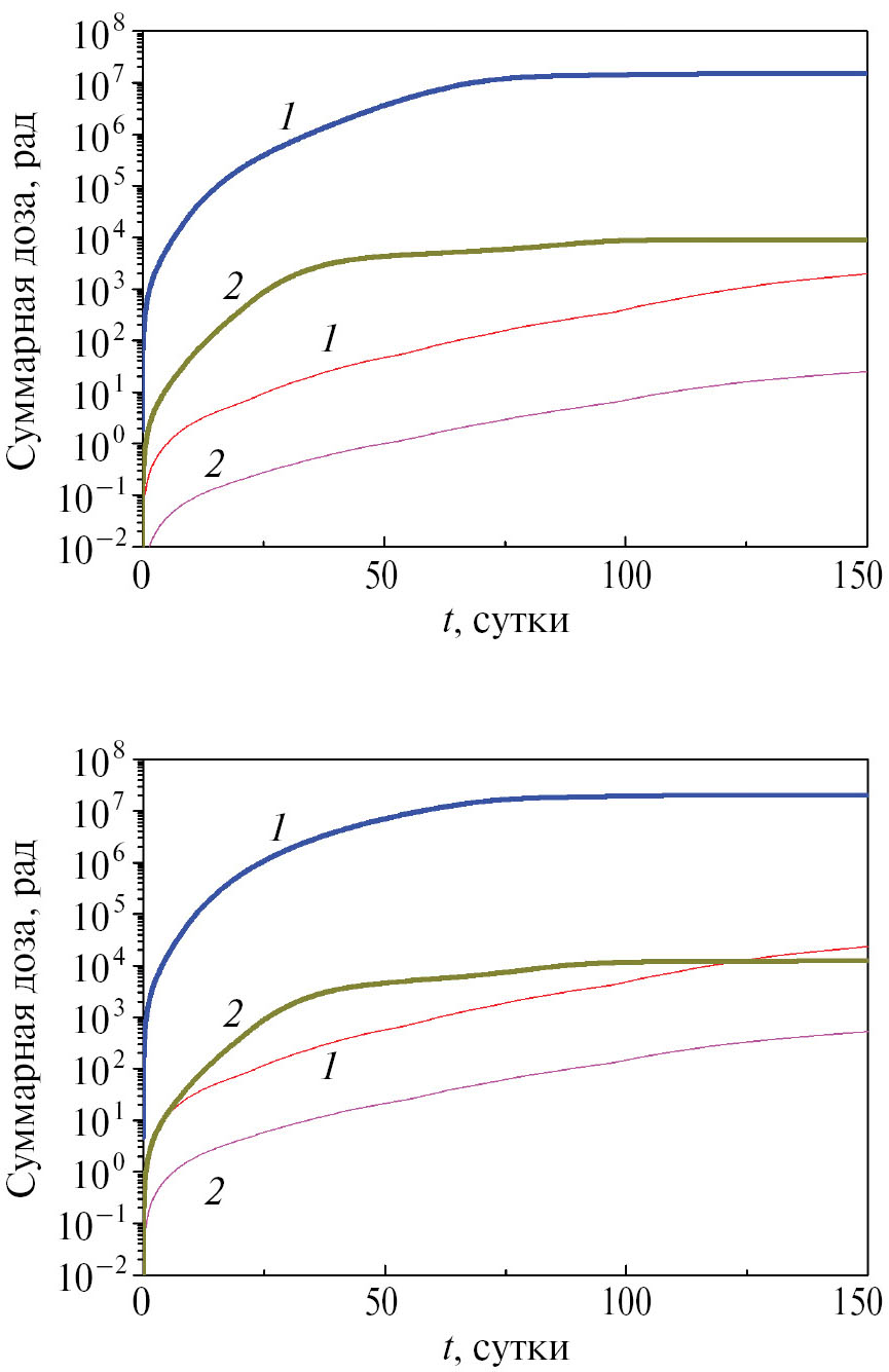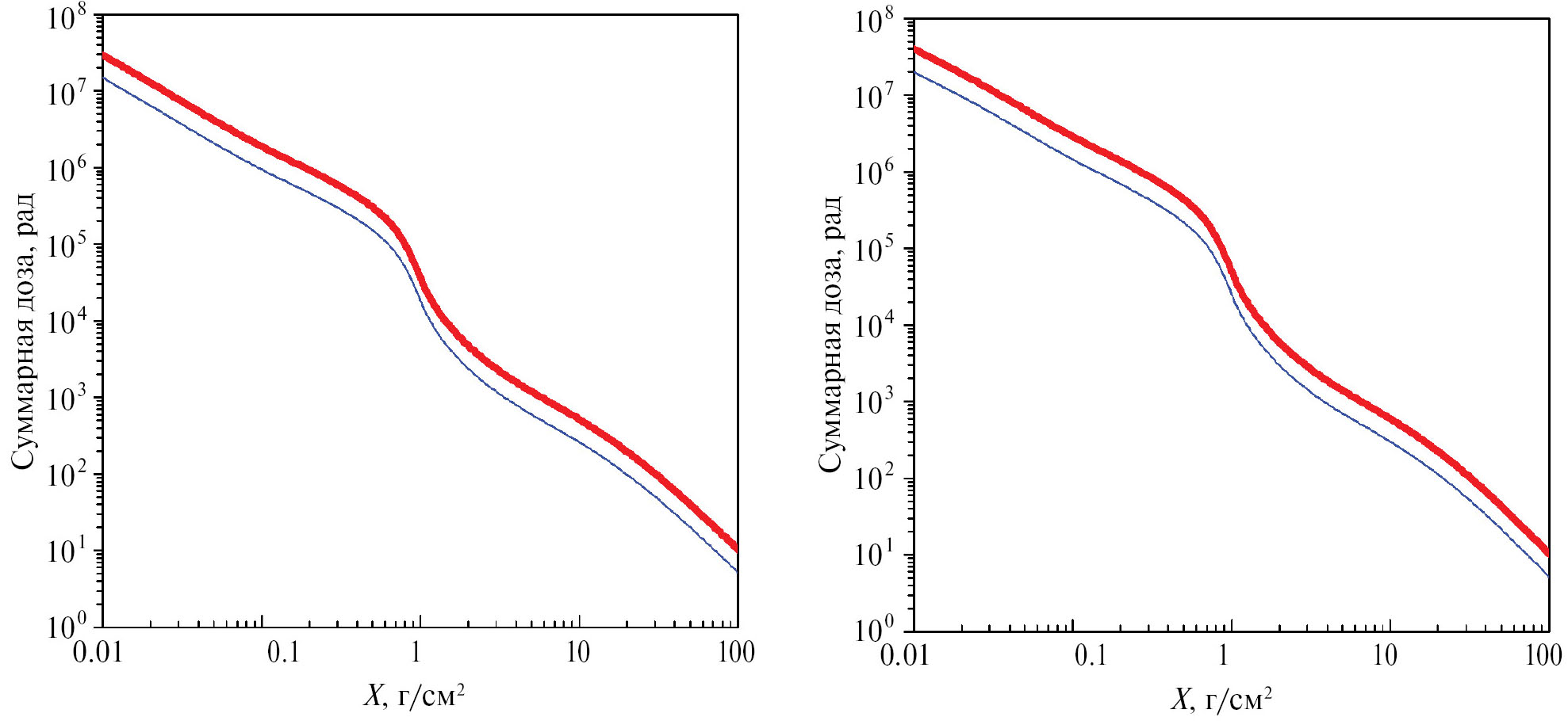 При этом, как видно из рис. 3, даже тонкая защита толщиной 1 г/см2 снижает суммарную дозу на три порядка.